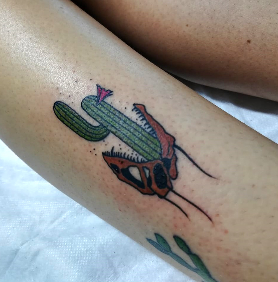 Raptor skull and cactus by John from Awhe tattoo studio in Boksburg. Done at Comic Con Africa