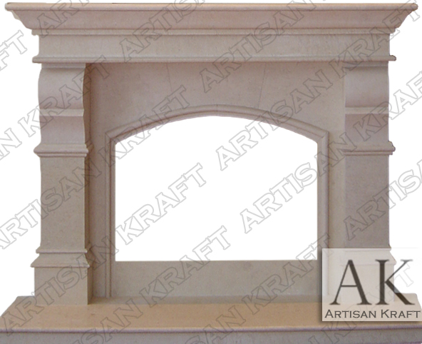 Metropolis marble fireplace in a creamy beige color. Arched opening above the firebox. Similar to the Winnetka style but the corbels have a trim one them.