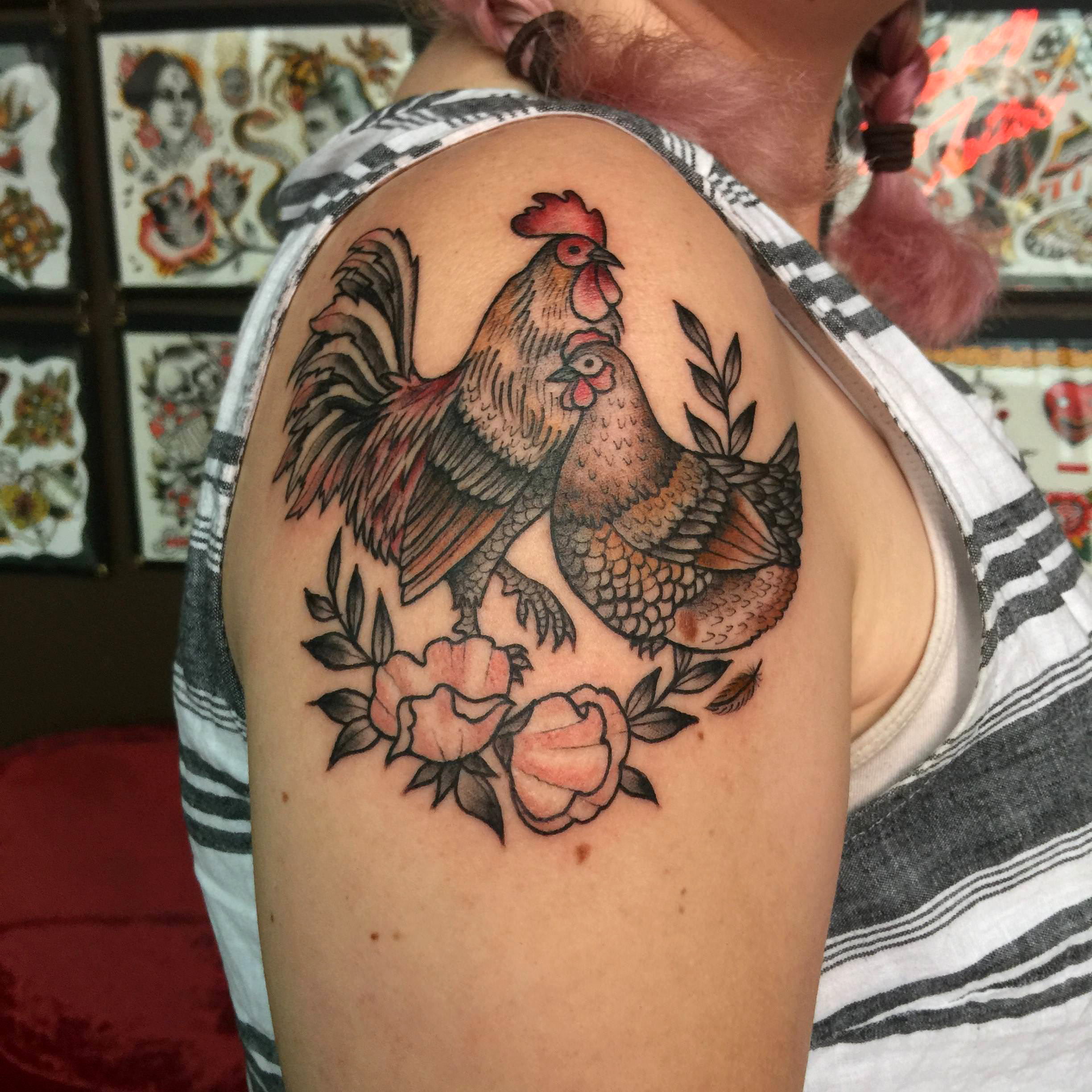 Chicken and rooster with sweet pea flowers. Done by Laura Graham at Grizzly Tattoo in Portland, OR