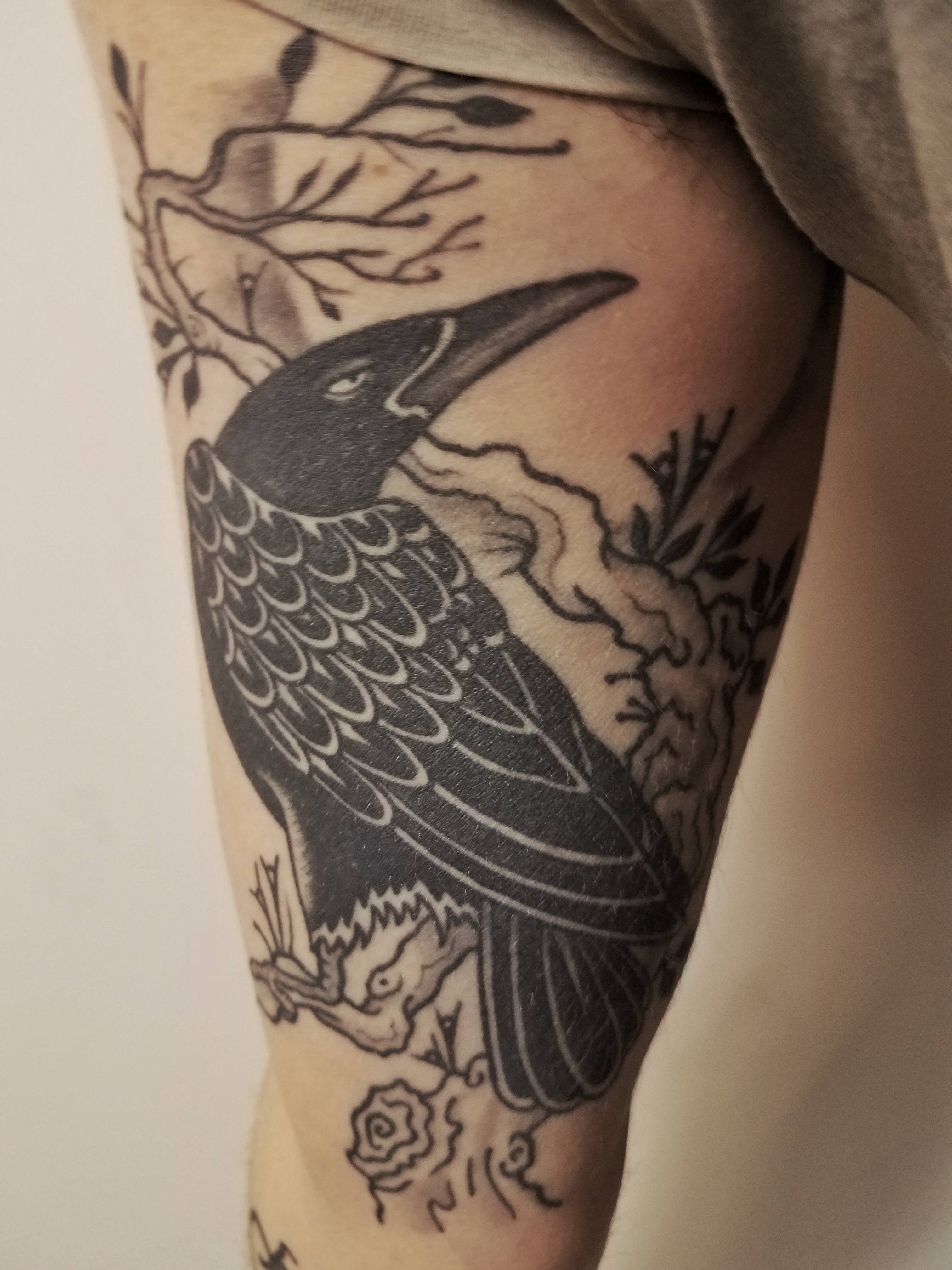 Japanese style crow, tattoo by Brian from The End is Near and Hand of Glory in Brooklyn