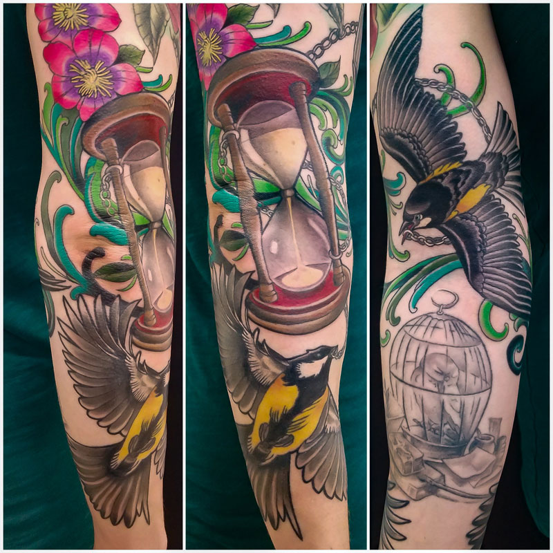Birdies and Hourglass by Adam Sky, Resolution Tattoo Studio, San Francisco, California