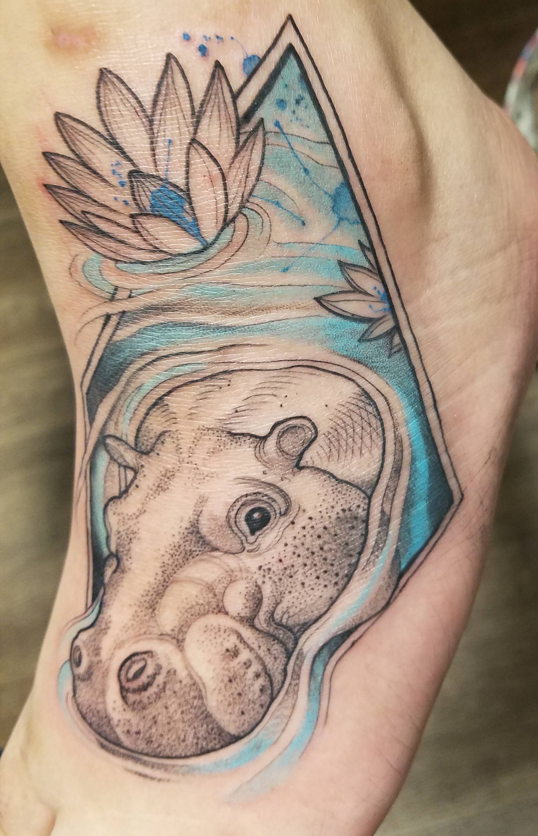 Hippo tattoo done by Tyson Taumaoe at Reverent Tattoo in Las Vegas, NV