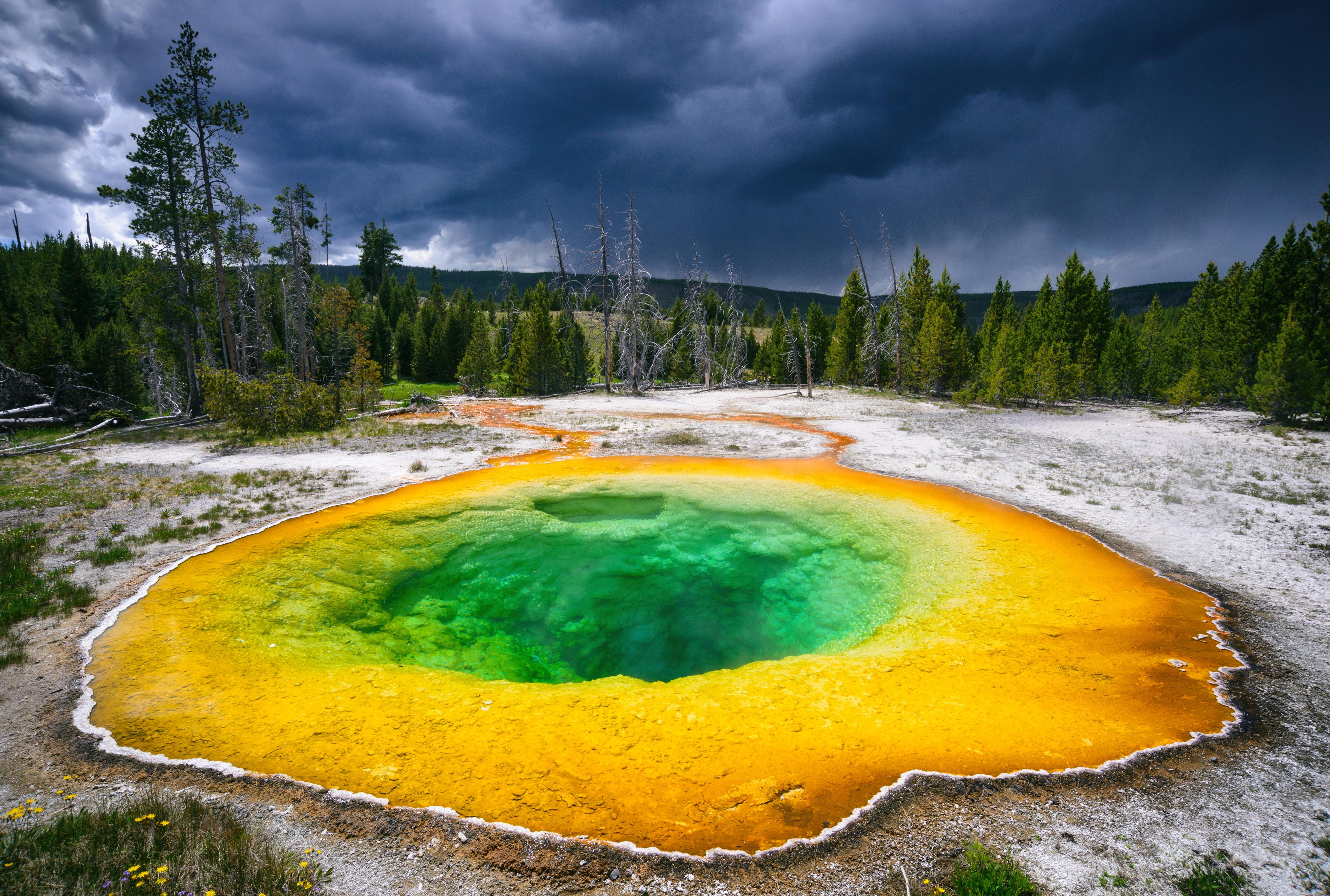 Morning Glory Pool in Yellowstone NP used to be blue, but coins have dyed it green and yellow