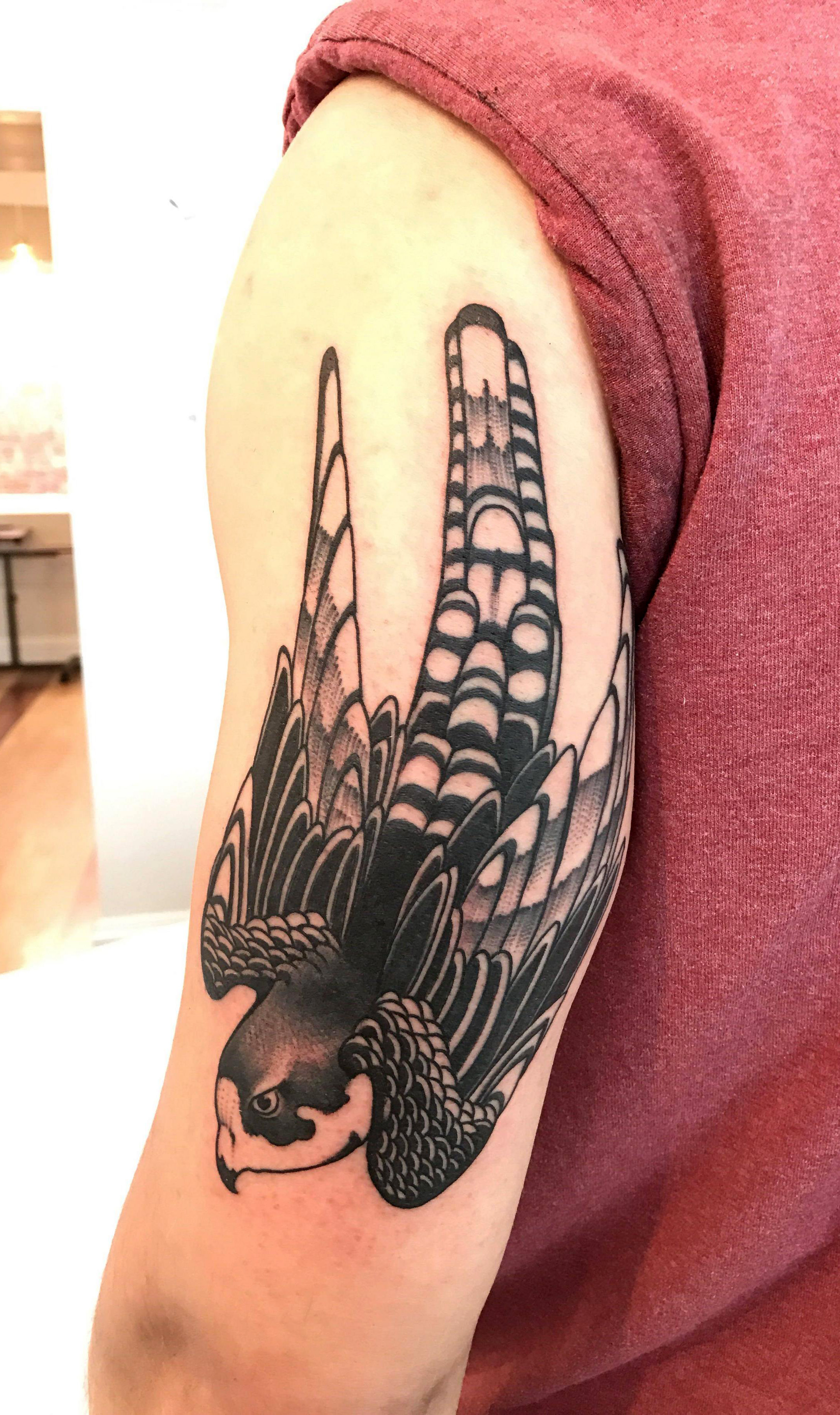 Peregrine falcon tattoo by Barham Williams at Fable Tattoo in Richmond, VA