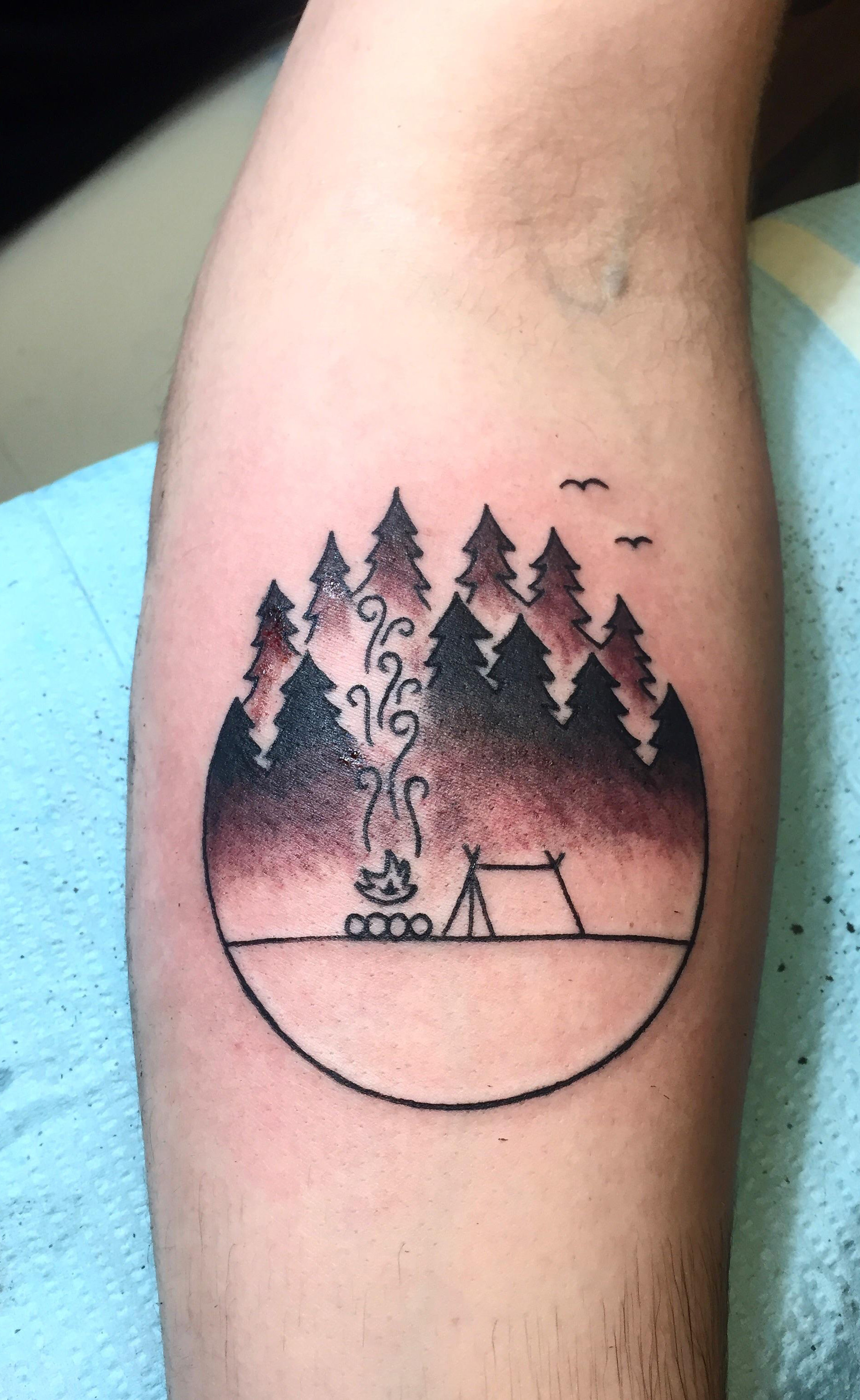 Tent with a fire, tattoo Done by Jesse @ scorpion tattoo in Derry, NH