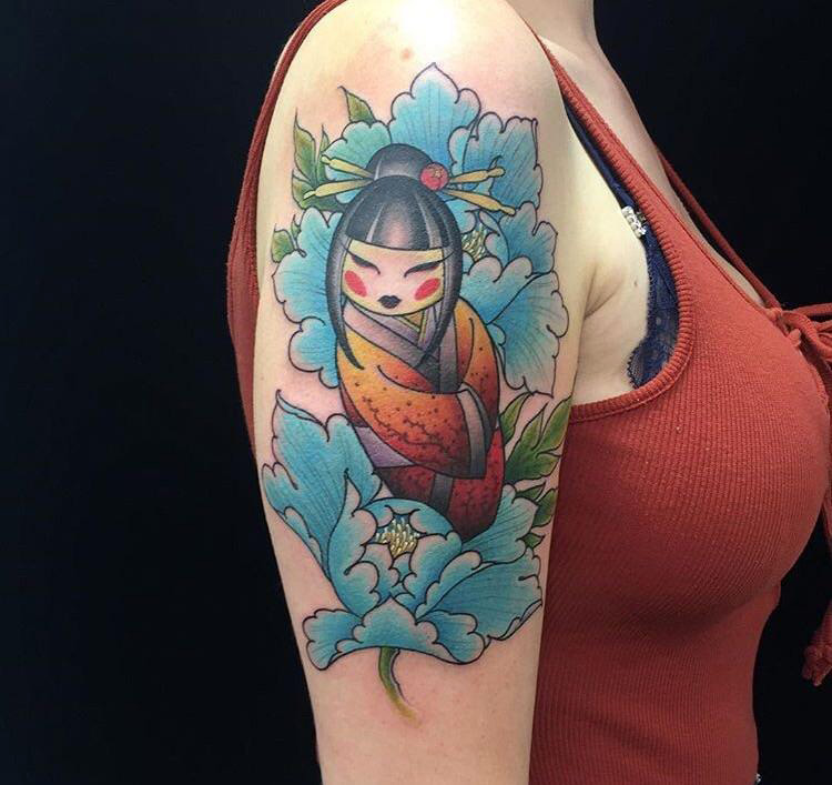 Kokeshi doll and peonies, by Chris Rushmer @ Freestyle tattoo studio, Canberra, Australia