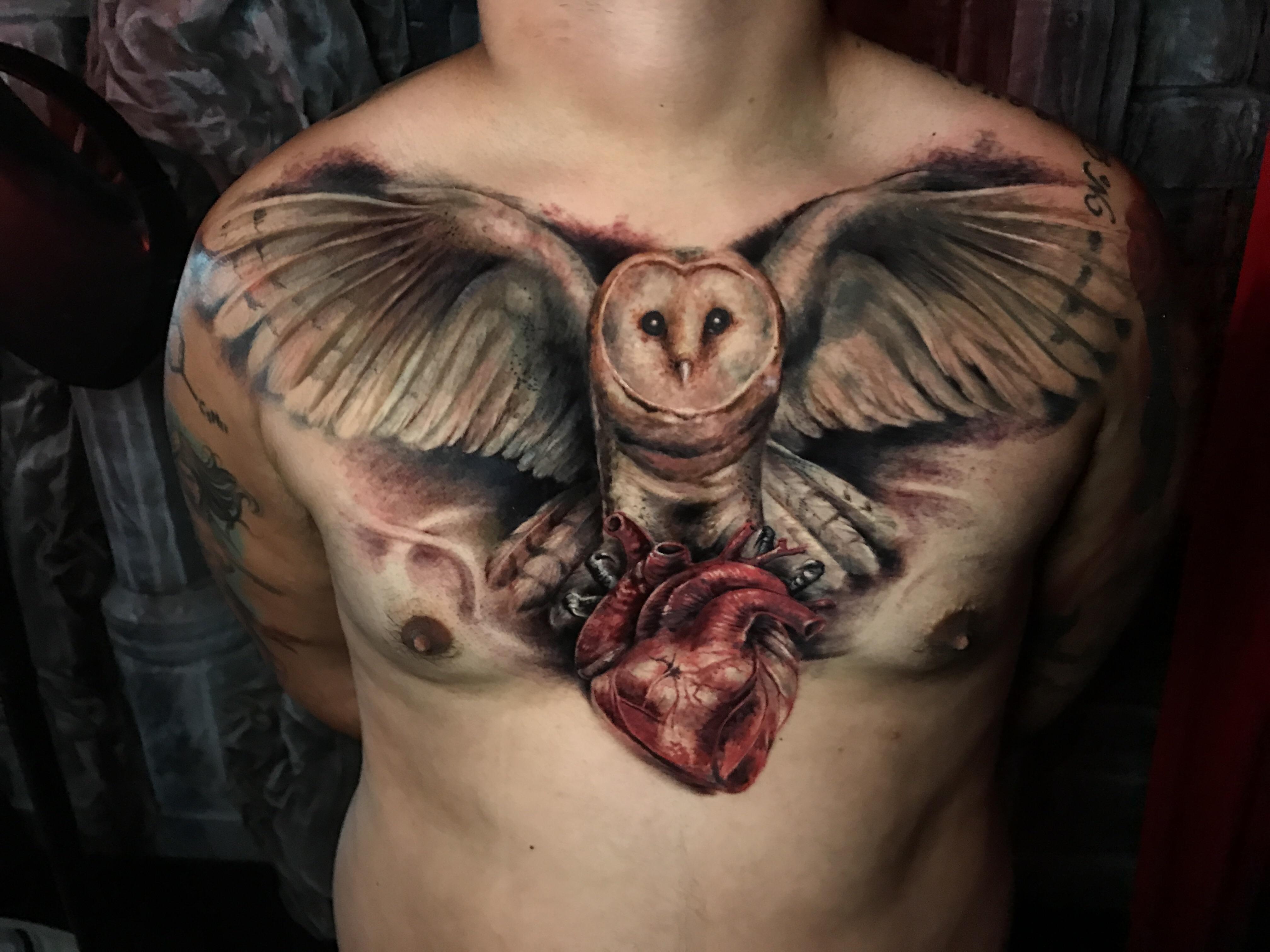 Owl and heart. Art by Yomico Moreno from Last Rites Tattoo NYC