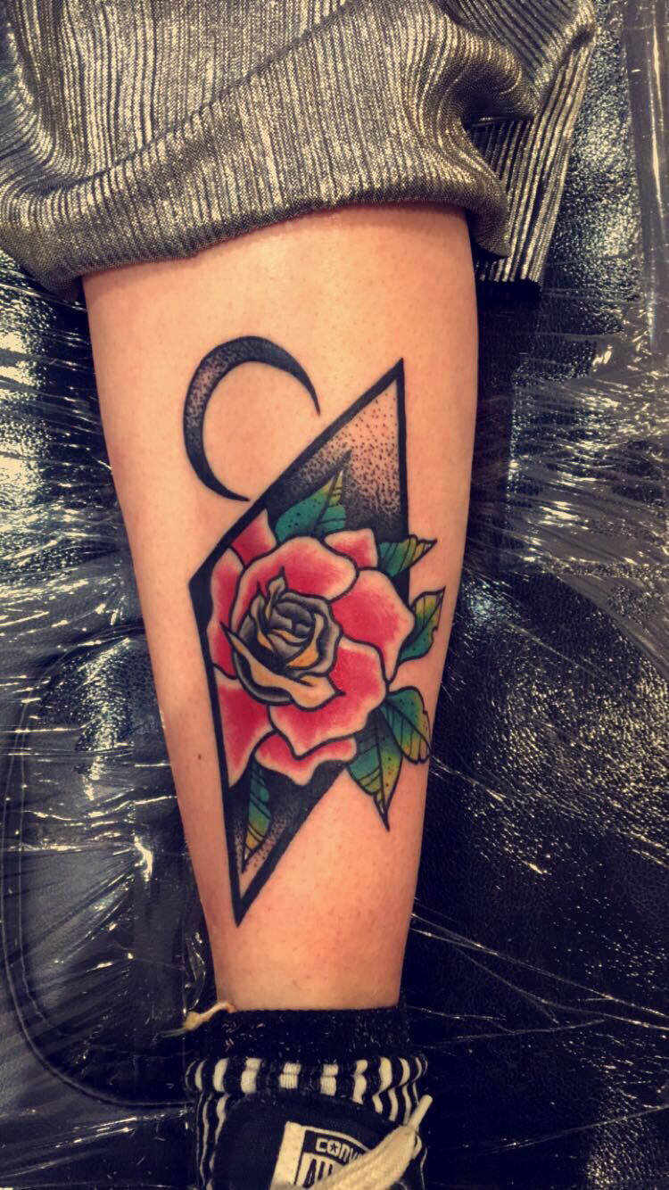 Rose and moon tattoo by Tom Hansell at The Life and Times Studio, Manchester UK