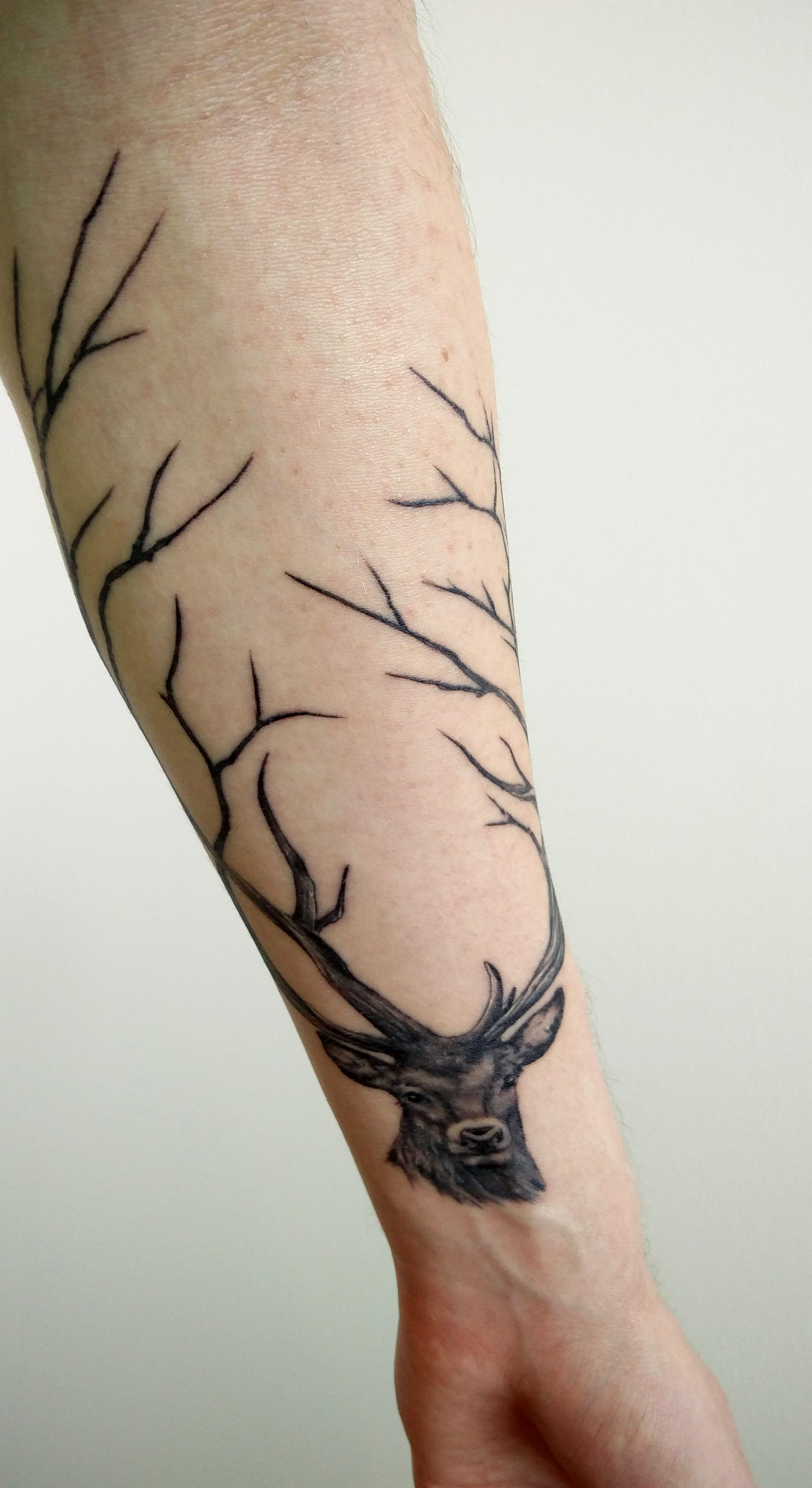 Deer buck tattoo, branches as antlers. Done by Roni Airling at Blue Dragon Tattoo, Helsinki, Finland