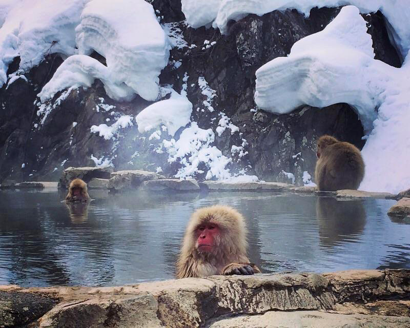Wild snow monkeys relaxing in an onsen, hot spring in Nagano, Japan