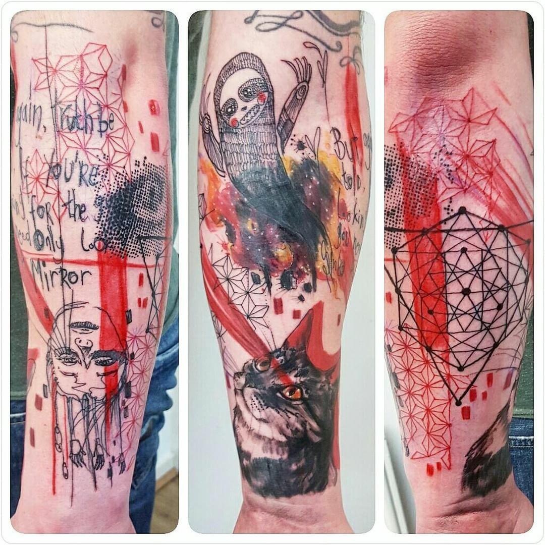 Trash polka half sleeve, tattoo lovingly done by Joanne Baker, Grizzly Art Collective, Coventry, UK