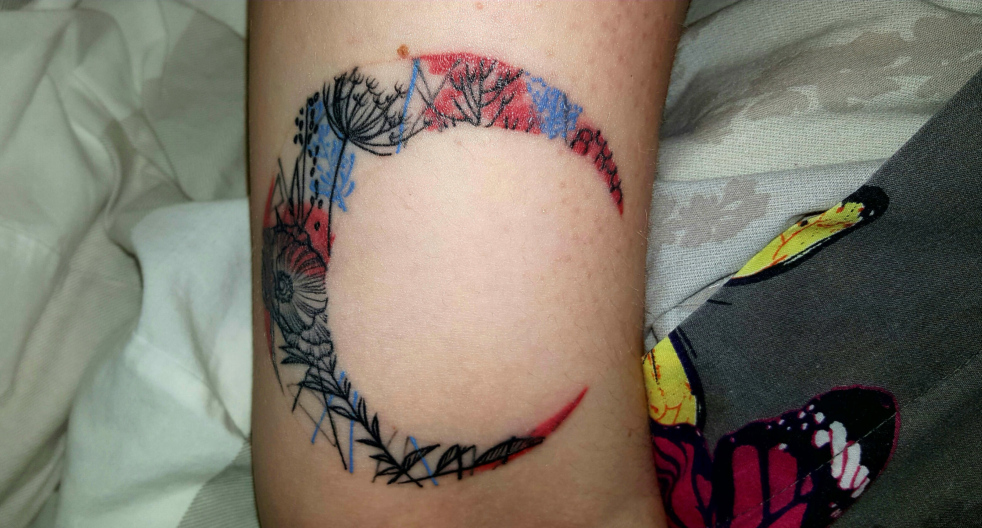Floral crescent moon, tattoo by Emma Sailor, Factotum, Norwich, UK