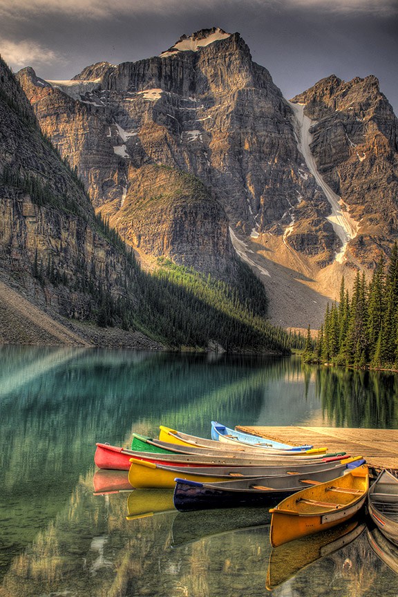 Colorful Canoes on Moraine Lake at Banff, National Park in the Canadian Rockies of Alberta, Canada