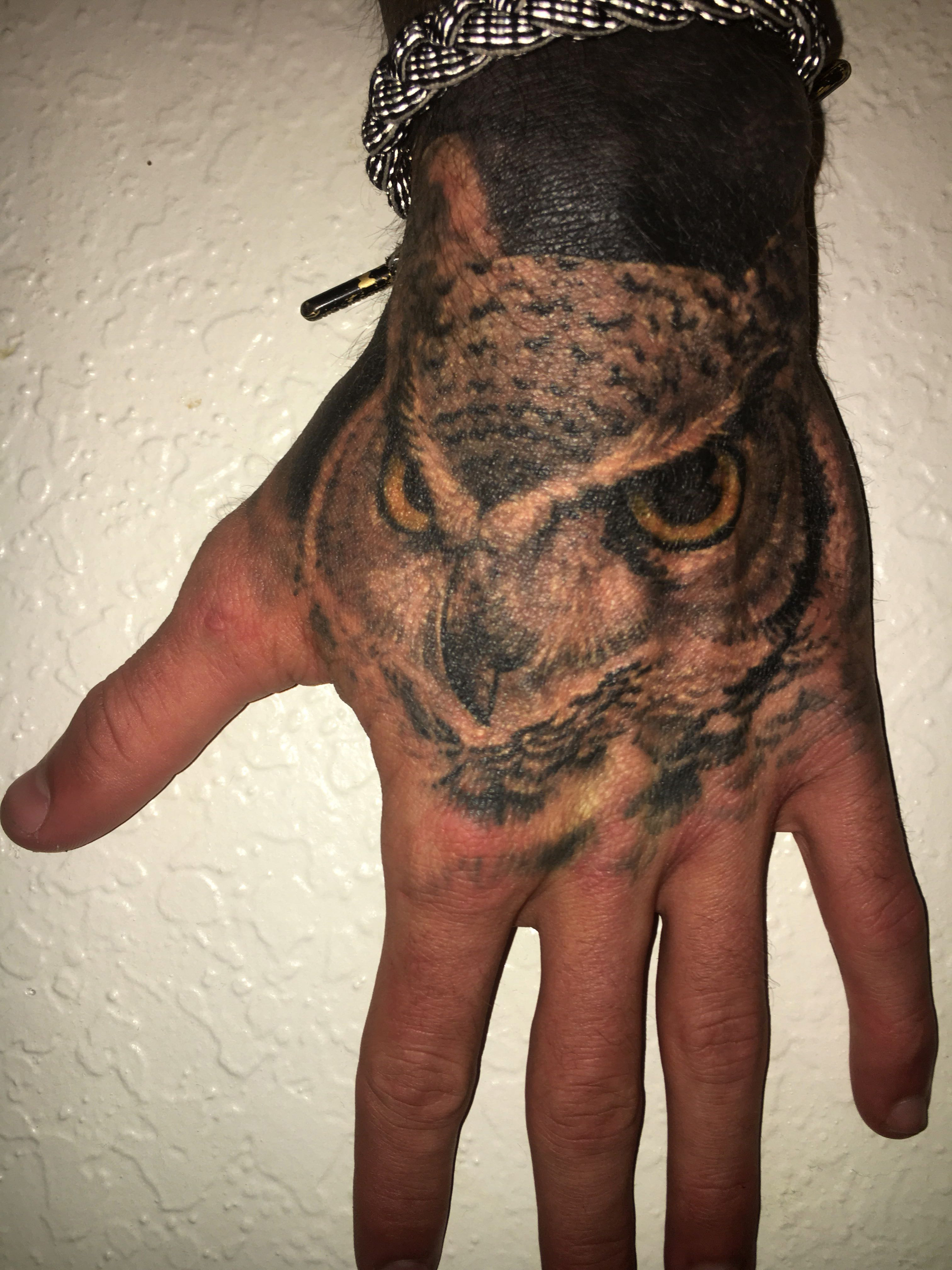 owl tattoo done by Noe at Contra Tattoo, Fresno, Ca
