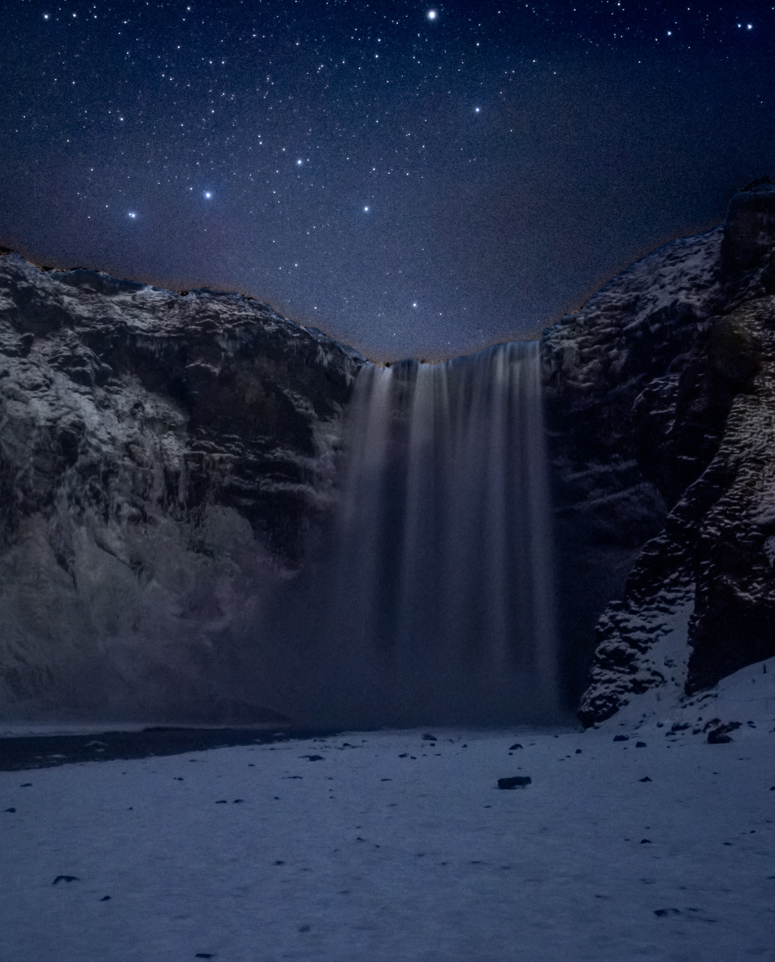 Iceland's very popular Skogafoss waterfall in the middle of the night