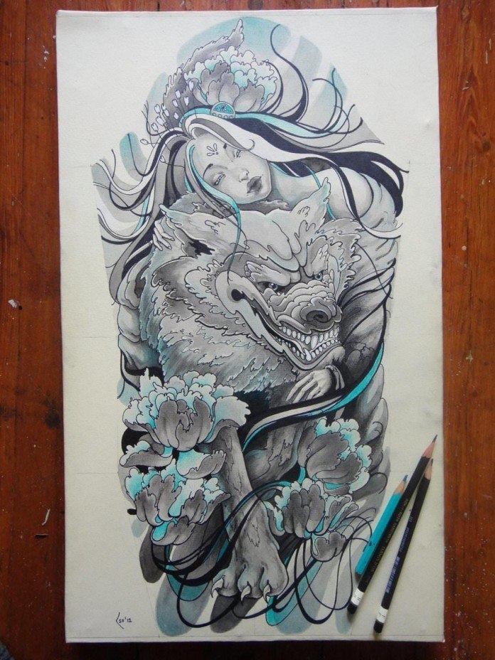 A beautiful girl holds her wolf in this fantasy tattoo sketch by