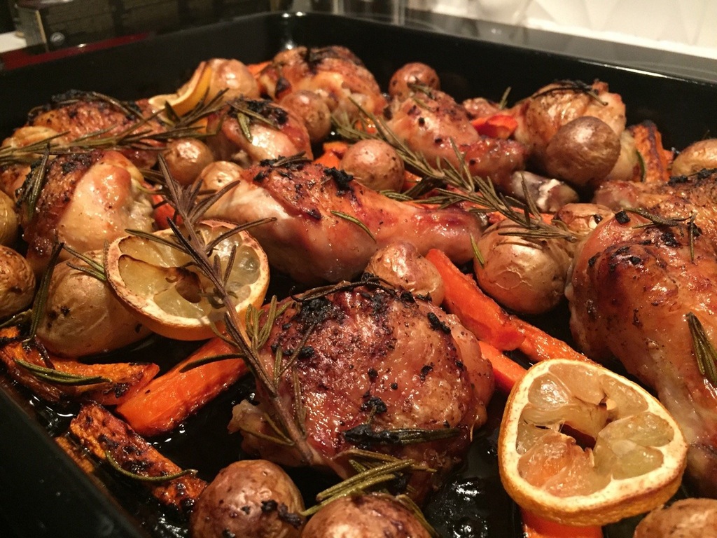 Oven roasted lemon garlic chicken with carrots and potatoes