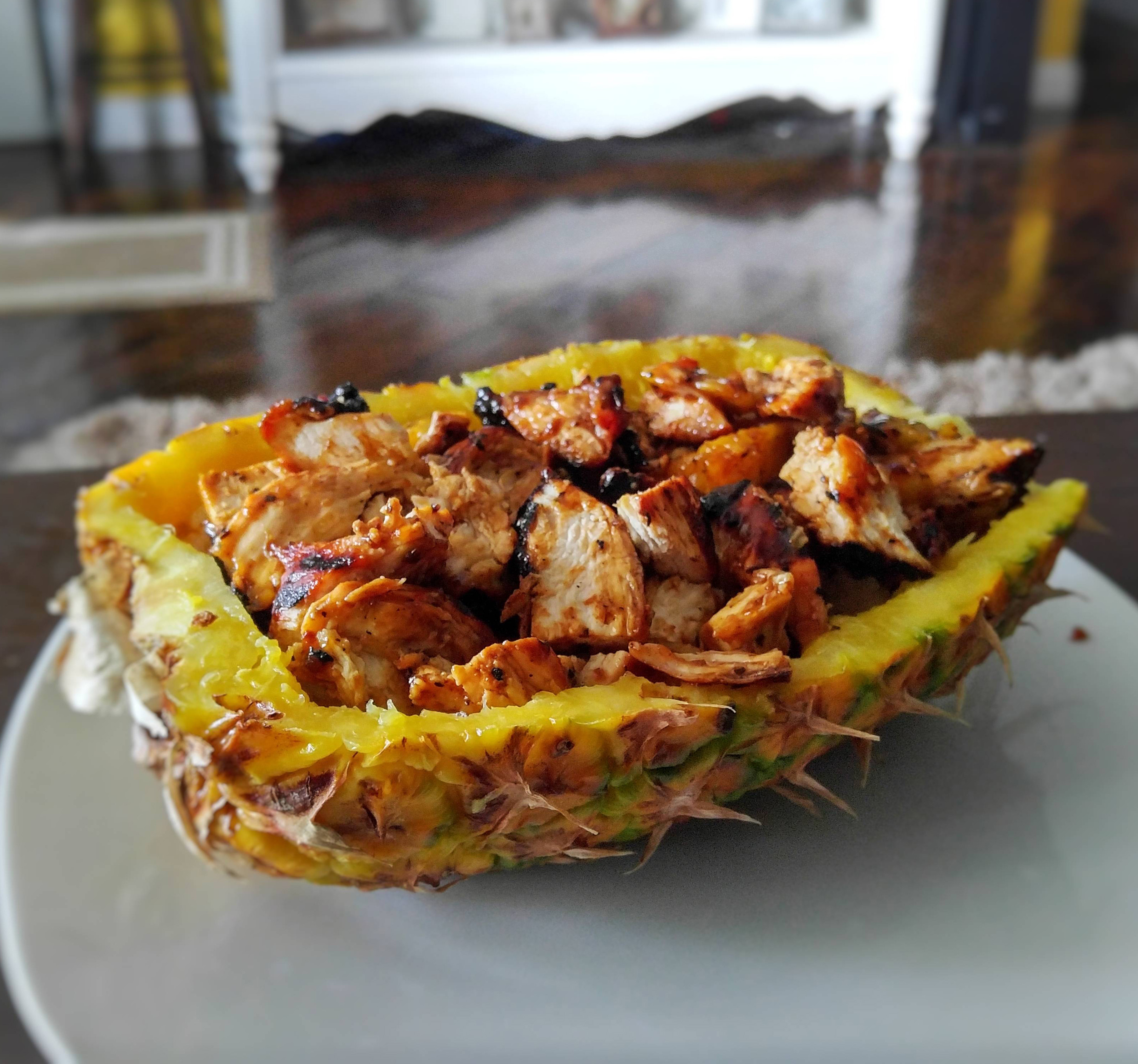 Caribbean Jerk Chicken with pineapple on Jasmine rice in a pineapple bowl