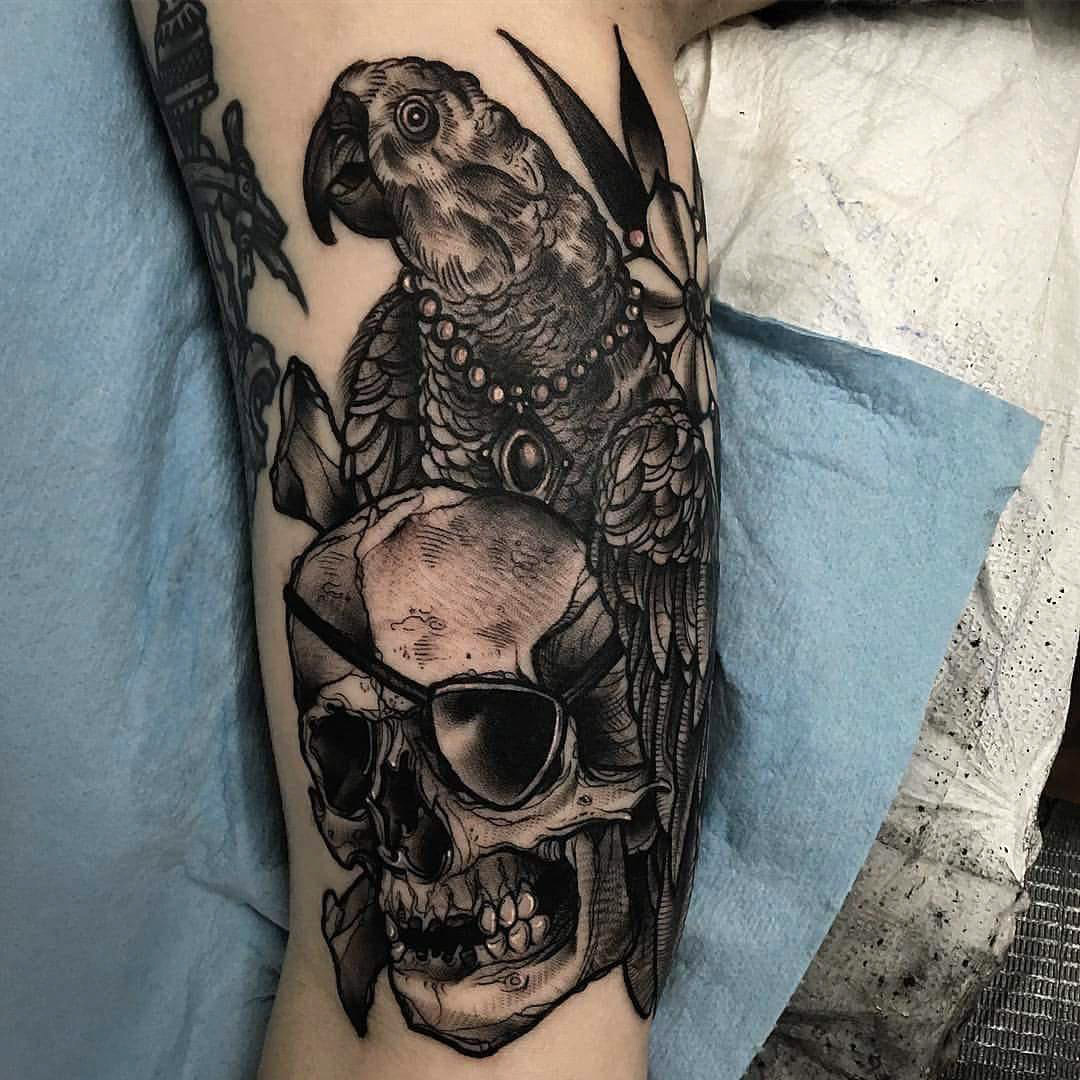 Skull and parrot, tattoo by Andy Wiszowaty. Untold Gallery. Portage, IN