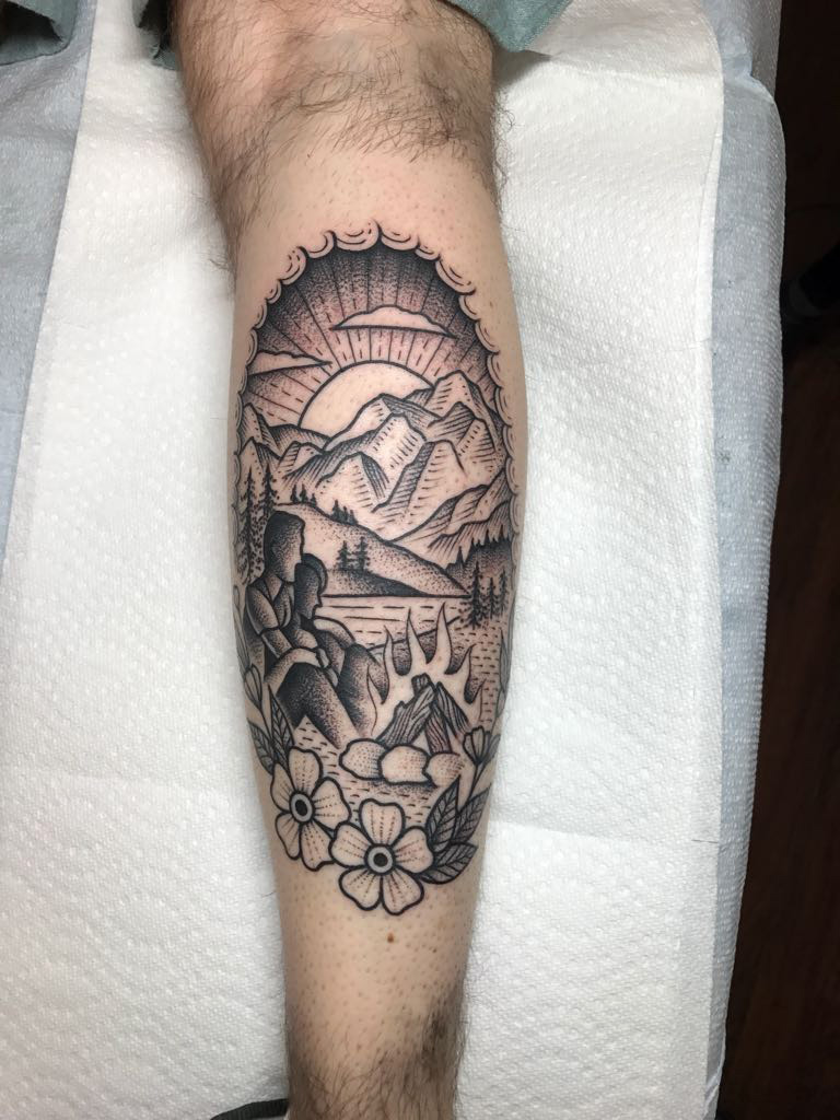 Mountain Scene tattoo by Christian Lanouette, Montreal