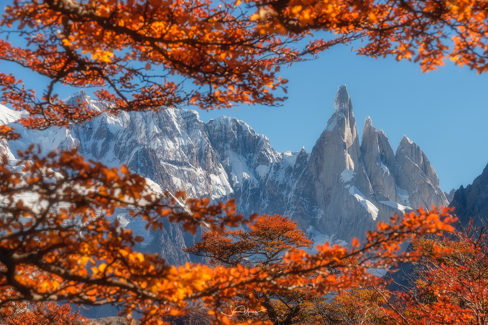 The autumnal coloured forest and Cerro Torre Mountain, South America. By Shaun Young