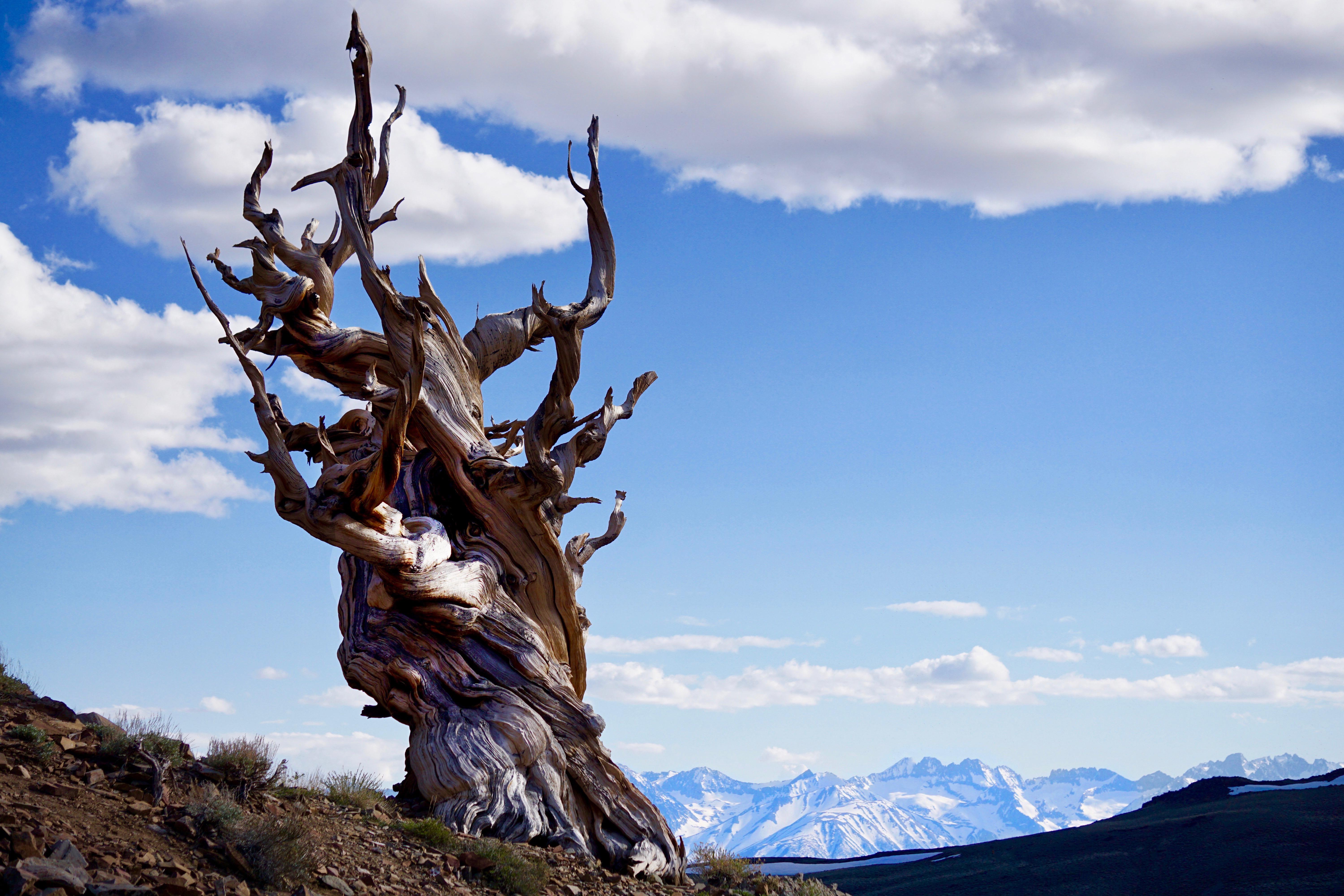 Ancient Bristlecone Pine in the Inyo National Forest, CA with the snow capped Sierra Nevada mountain