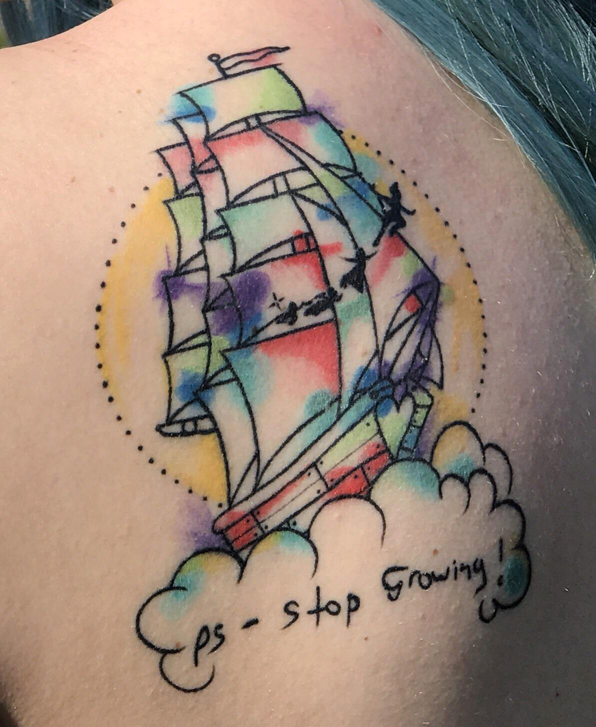 Peter Pan and Ship tattoo by Ben Martinez at Good Times Tattoo in SLC, UT