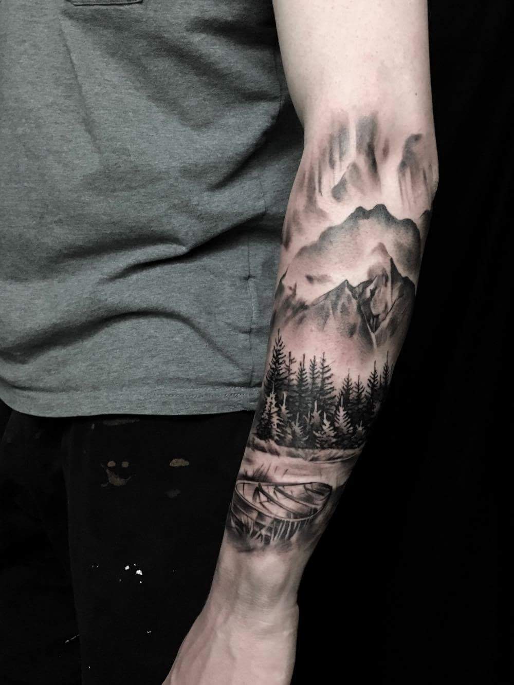 Norwegian landscape, tattoo by Bjarke Andersen at Sinners Inc, Denmark