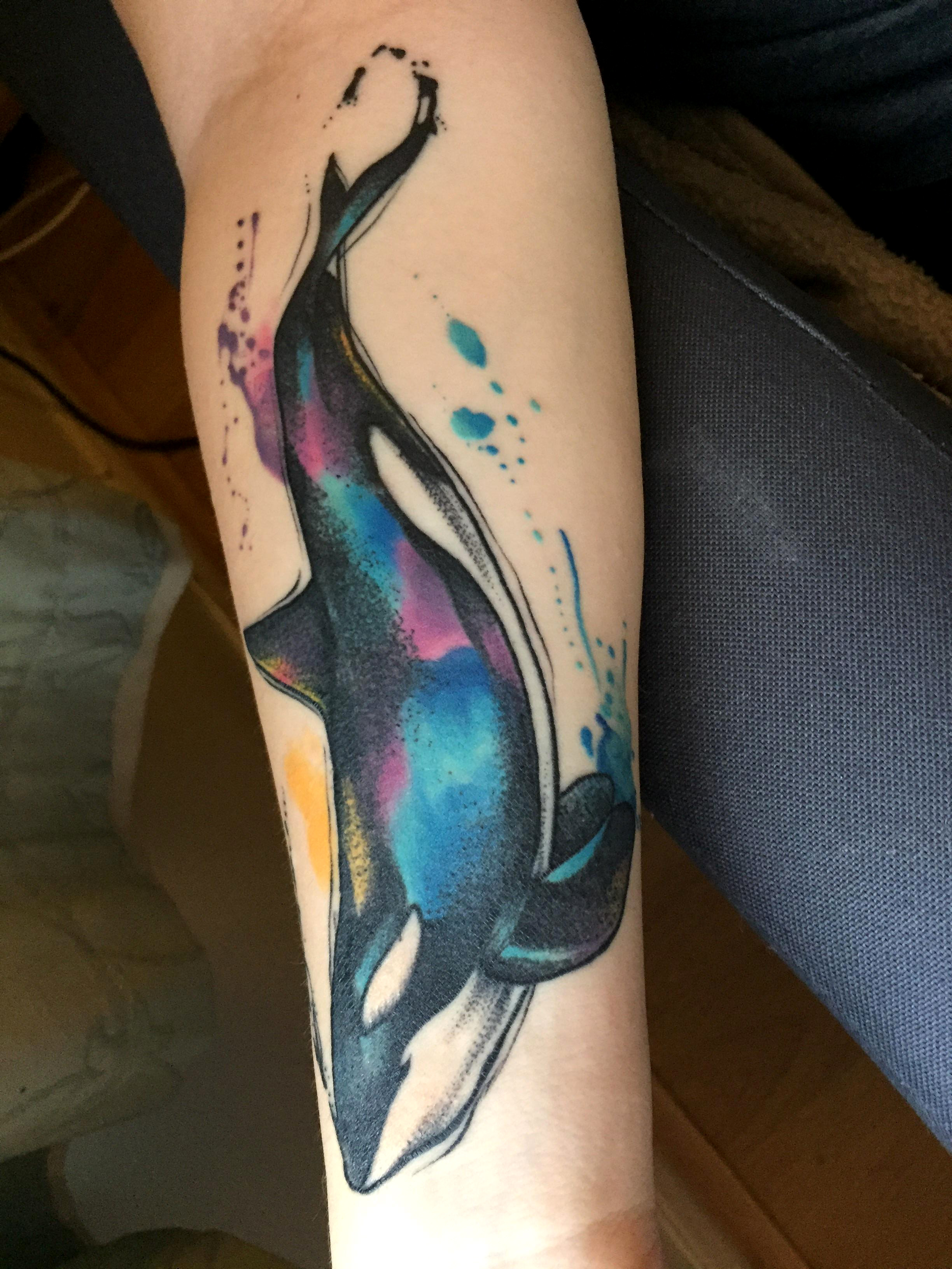 Watercolour Orca tattoo by Jo Azis, Rock n Roll Tattoo, Southampton, UK