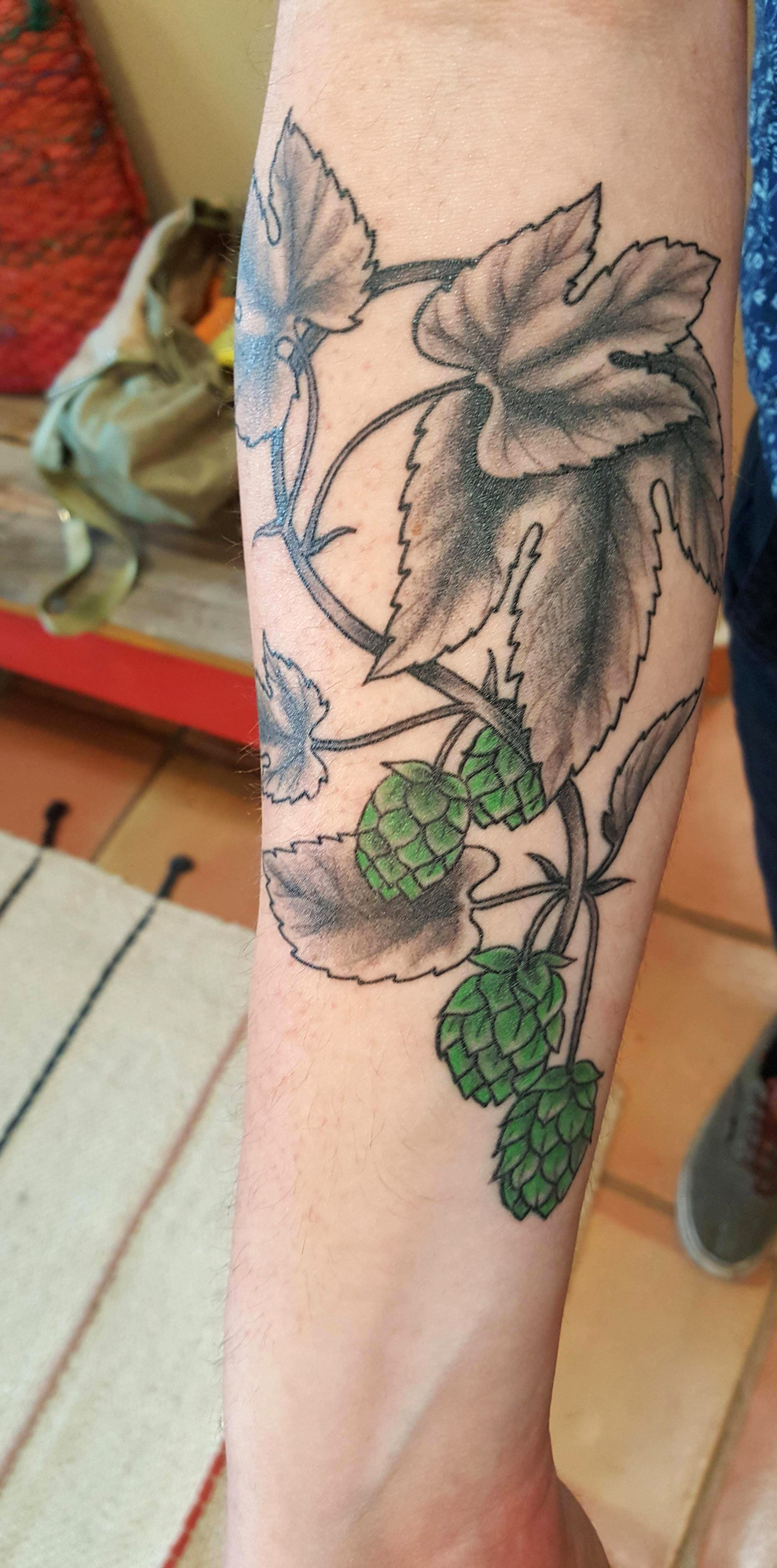 Hops tattoo by Crow B. Rising at Talis Fortuna, Santa Fe, NM