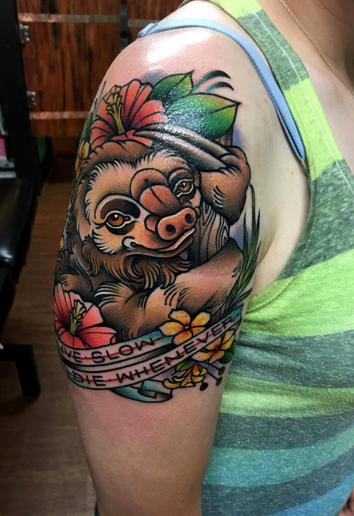 Sloth tattoo by Amanda Slater, Lakeside Tattoo in Richmond, VA