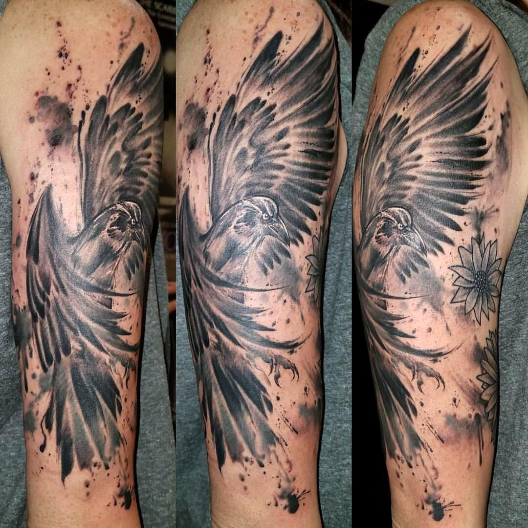 Raven tattoo by Terry Harwood, Eye Pollution Custom Tattoos. South Carolina