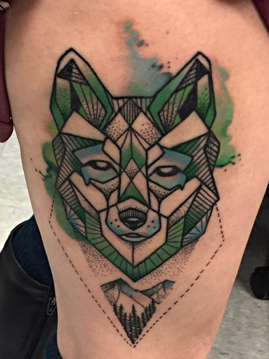 Watercolor geometric Wolf tattoo by Jon Murray at Brew City Tattoo in Milwaukee, WI
