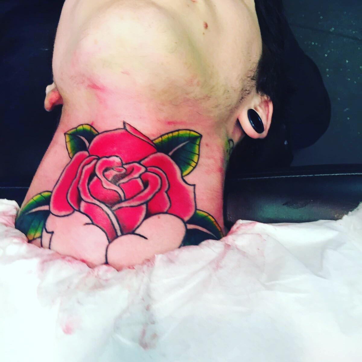 Traditional Rose Throat Tattoo, UK, Macclesfield, Carpe Diem Tattoo Studio by MicV