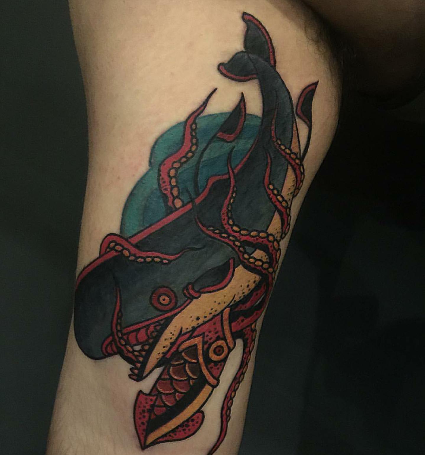 NeoTraditional Sperm Whale vs. Giant Squid by Jamie Santos Tymeless Tattoo Baldwinsville, NY