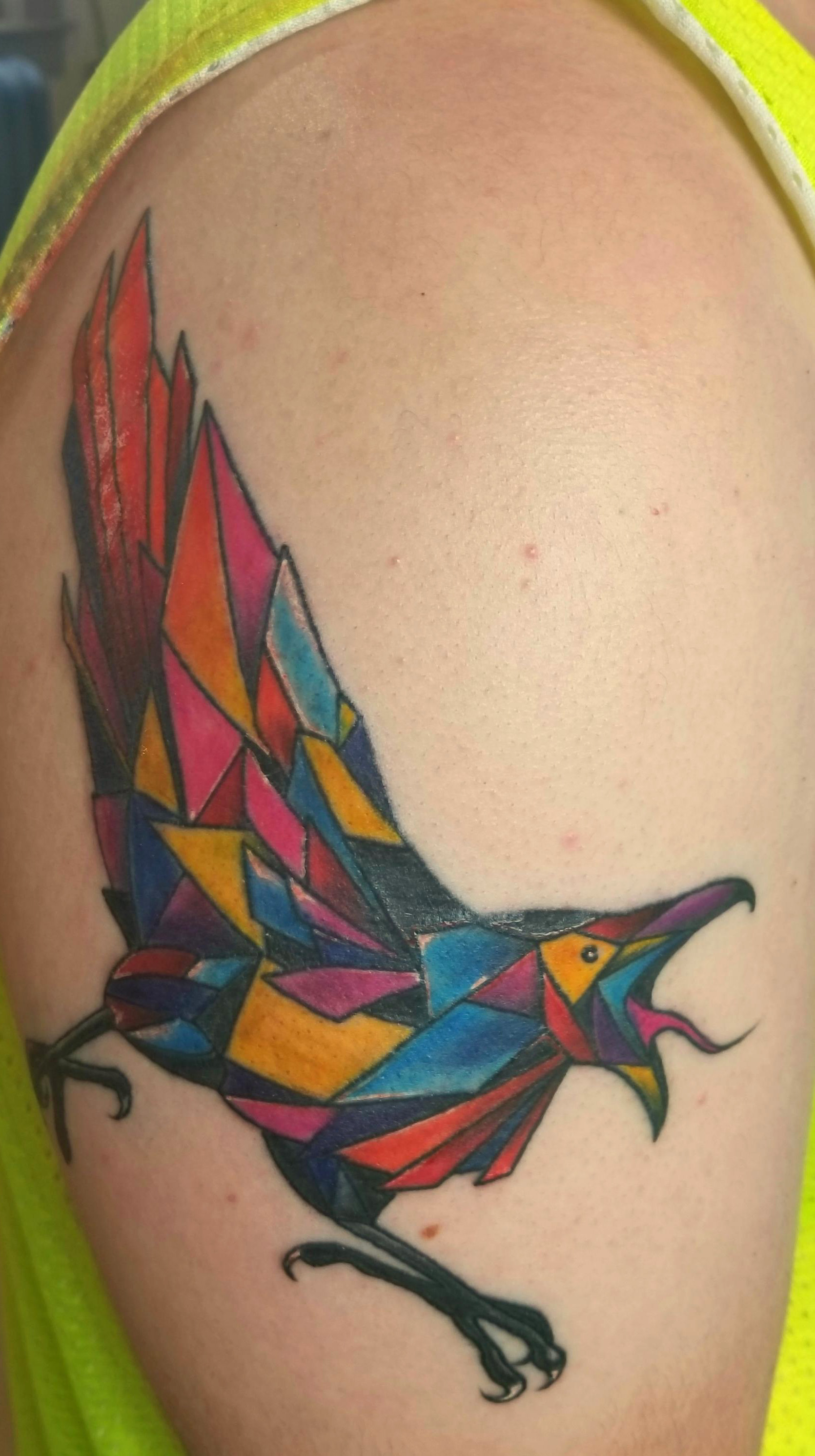 Stained Glass Crow tattoo by Wolf O'Toole, Charmed Life Gallery Baltimore , MD