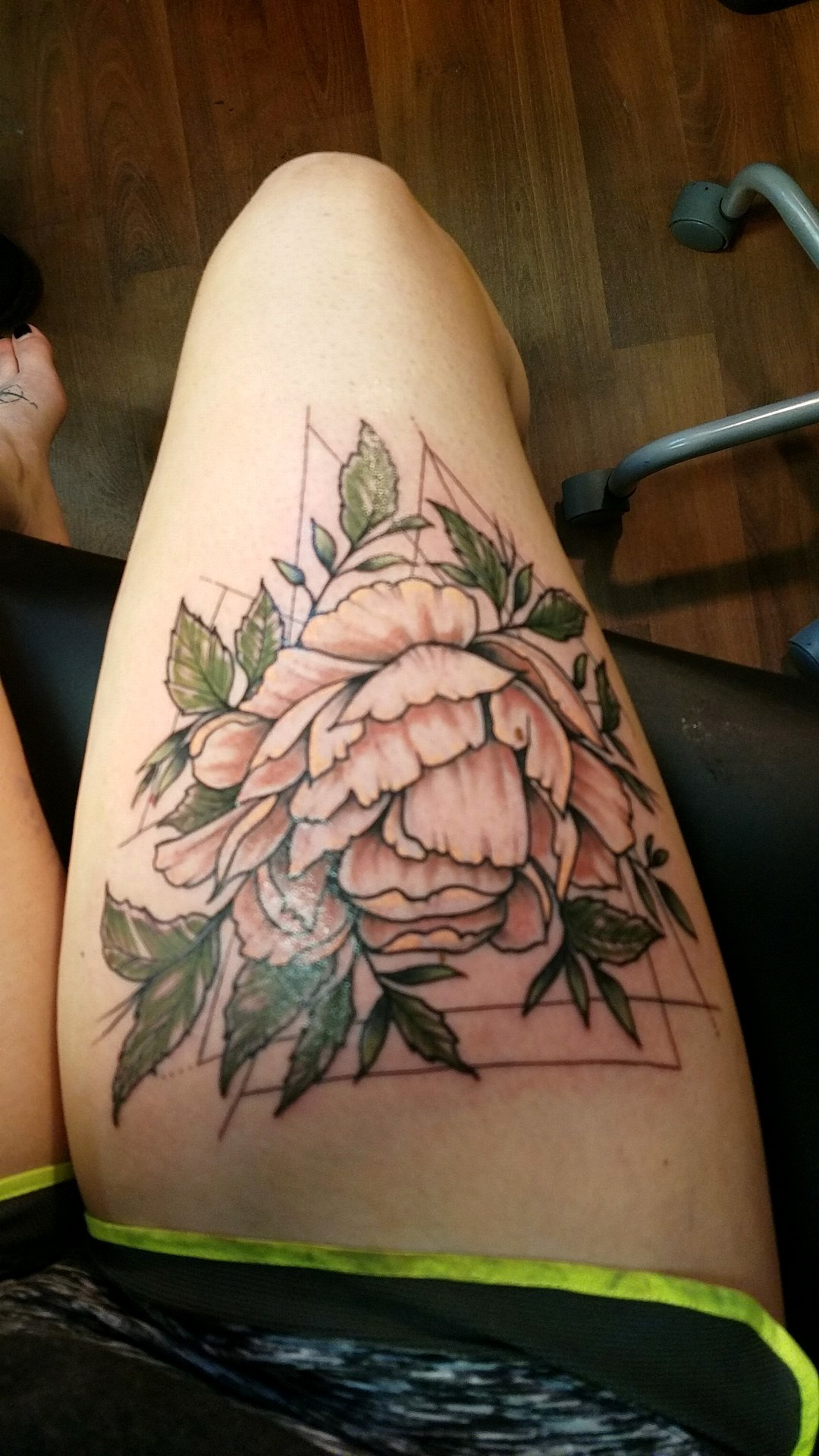 Peony flower thigh tattoo by Marky Hladish (@midwestlove) from Dark Heart Tattoo in Crystal Lake, IL