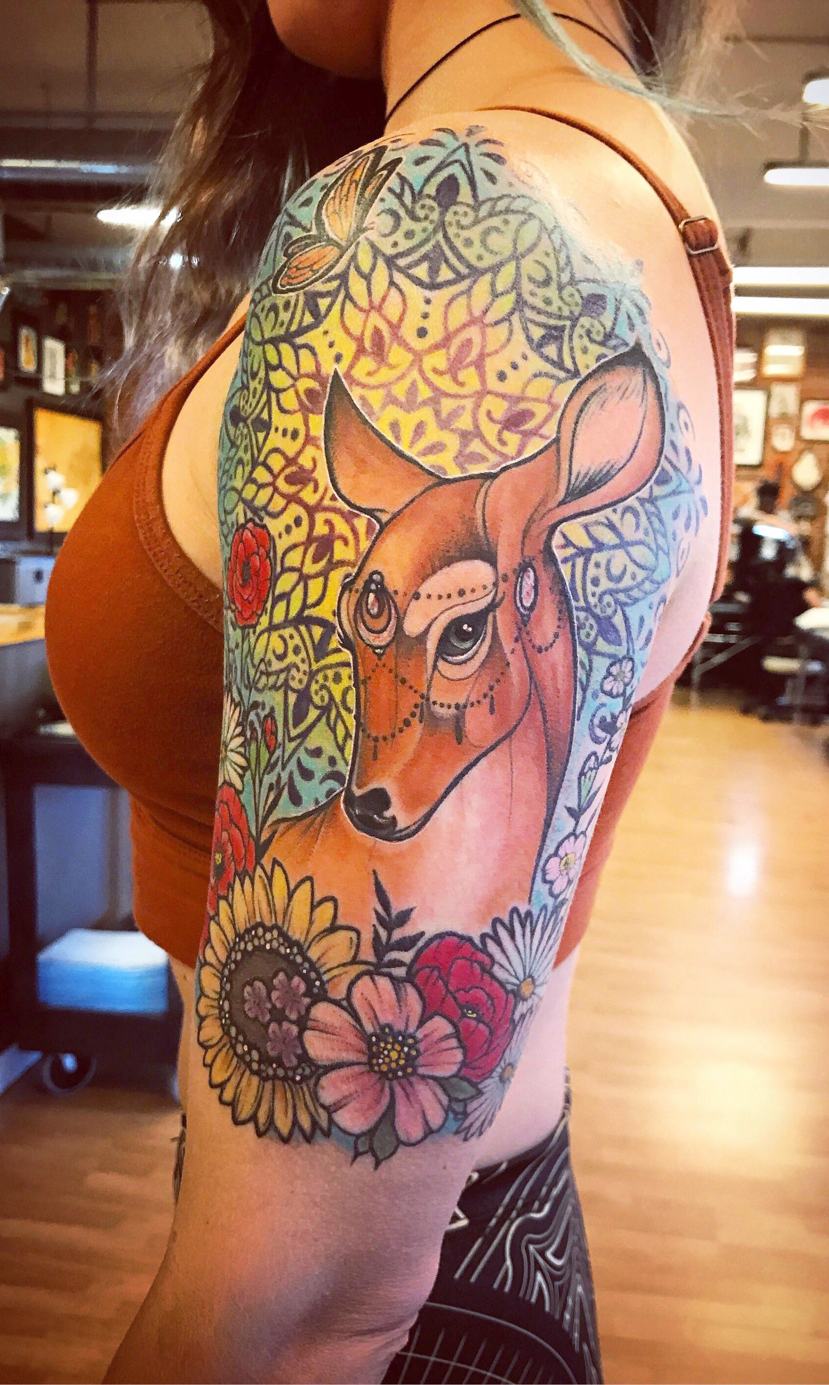 Deer tattoo, green eyed beauty. By Henry Quiles, Til Death Tattoo, Denver