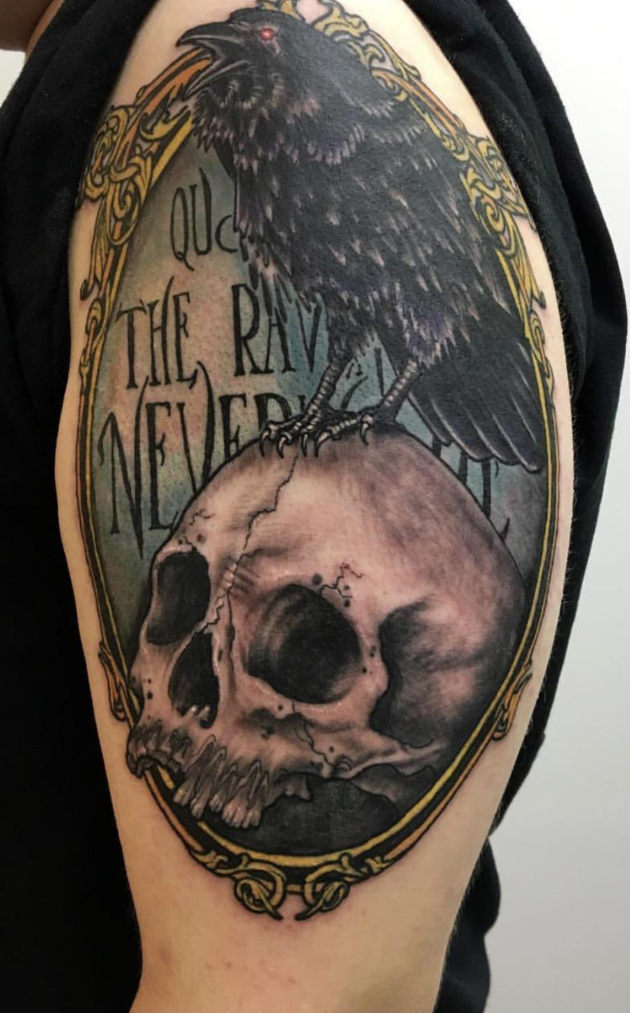 Raven and Skull tattoo by Rev. Bob at Lucky 13 in Richmond, Virginia