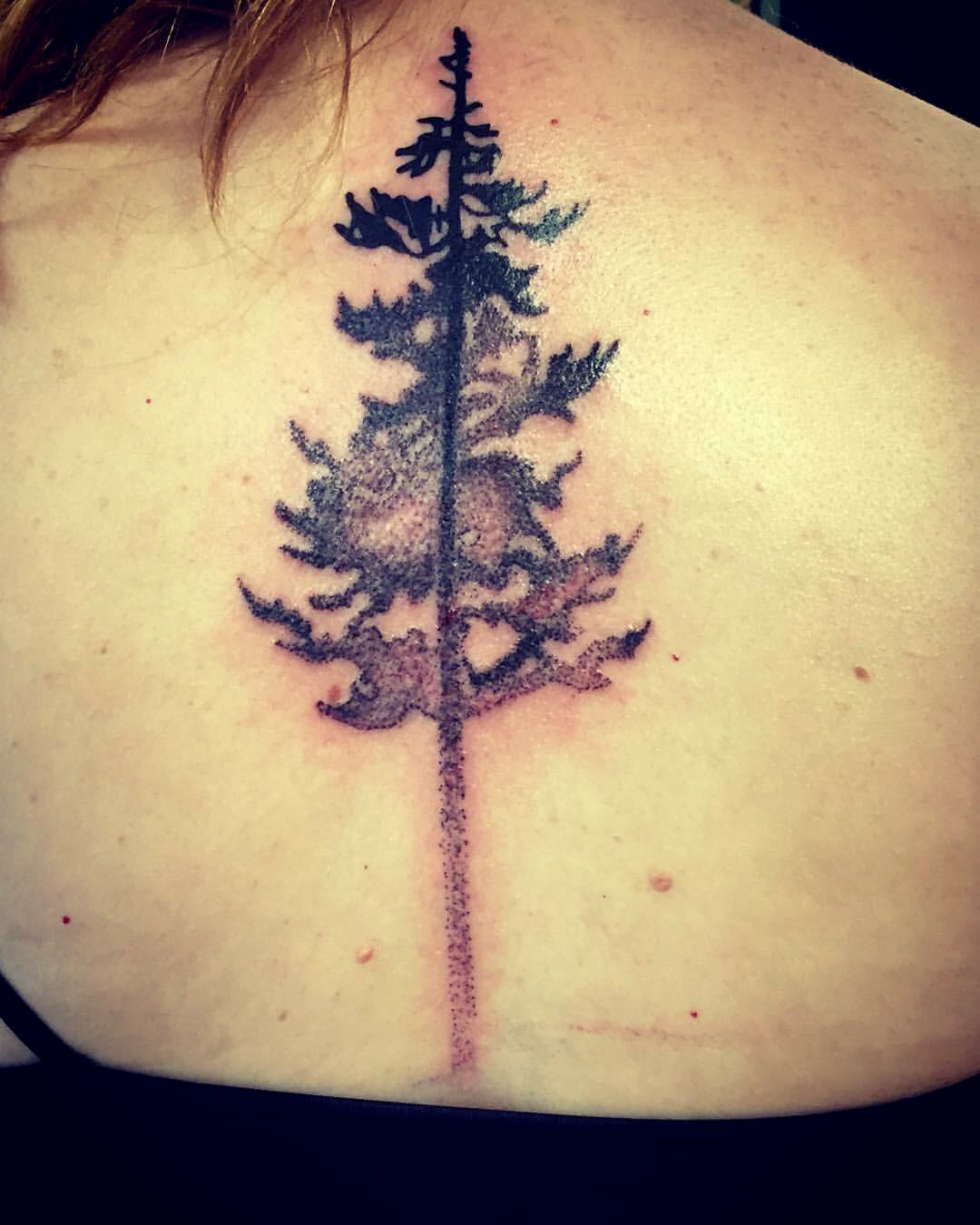 Spruce tree tattoo using poke technique by Sapo from Scorpion Tattoo studio in Houston