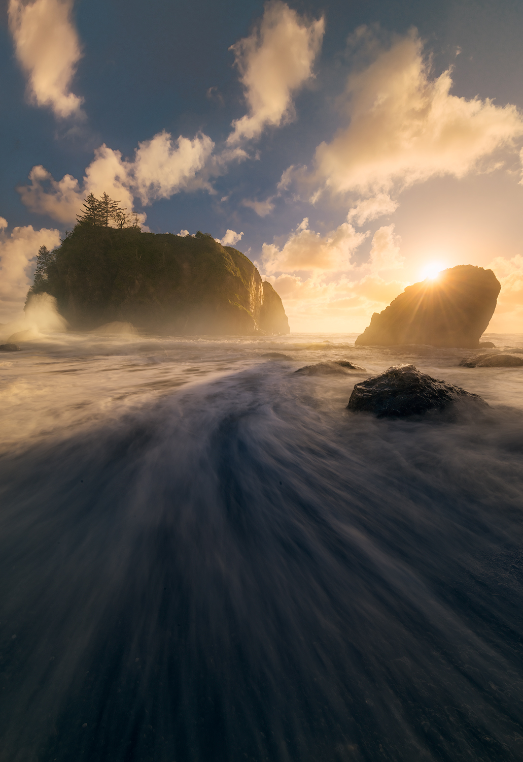 A sun star peaking over a sea stack along the coastline at Olympic National Park, WA