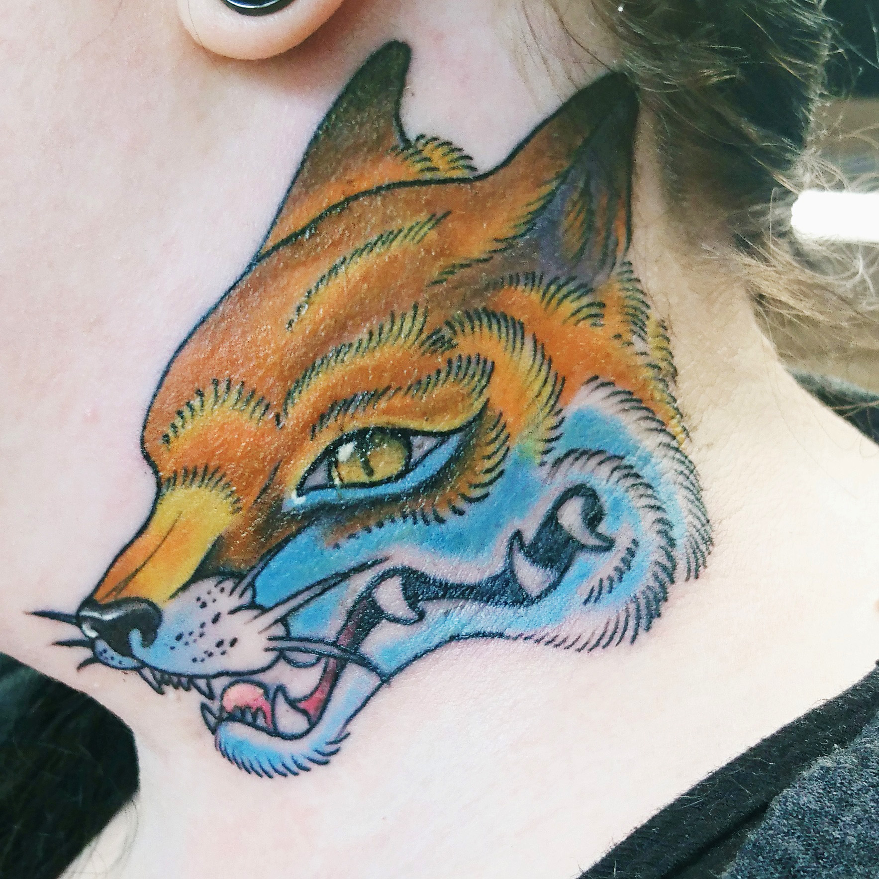 Neo fox tattoo on neck done by Chris Benson @ Crimson Empire, Edmonton, AB