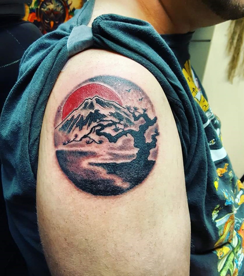 a tattoo of mount Fuji and a cherry blossom. By Big Mike.