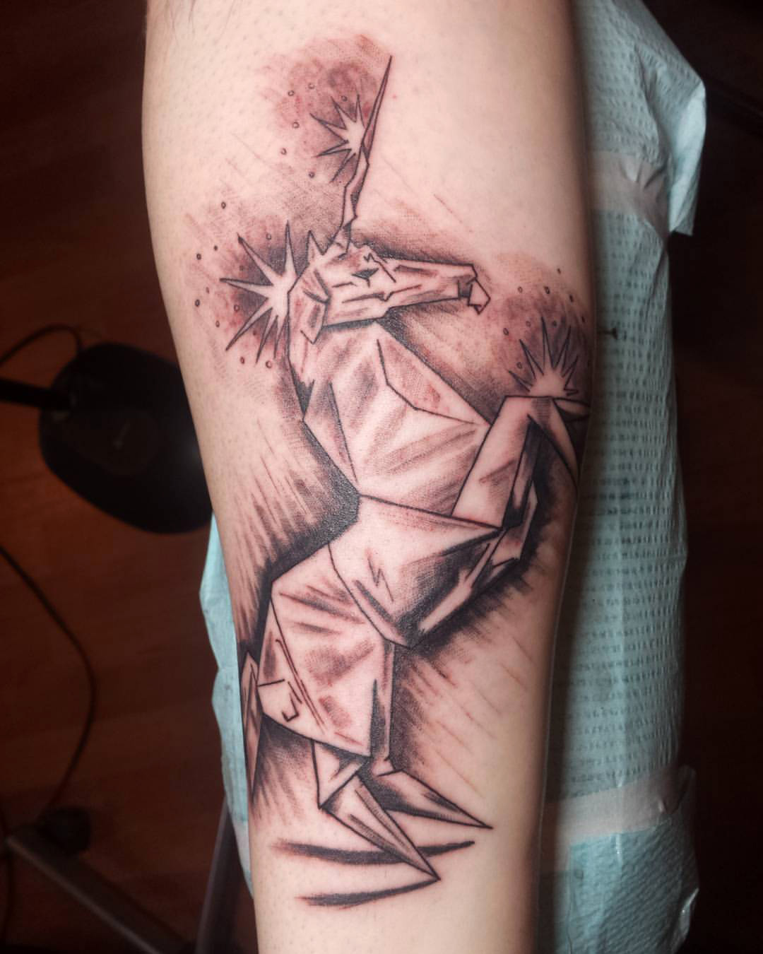 Origami Unicorn tattoo by Colin Bryant at Sacred Soul Tattoo in Renton, WA