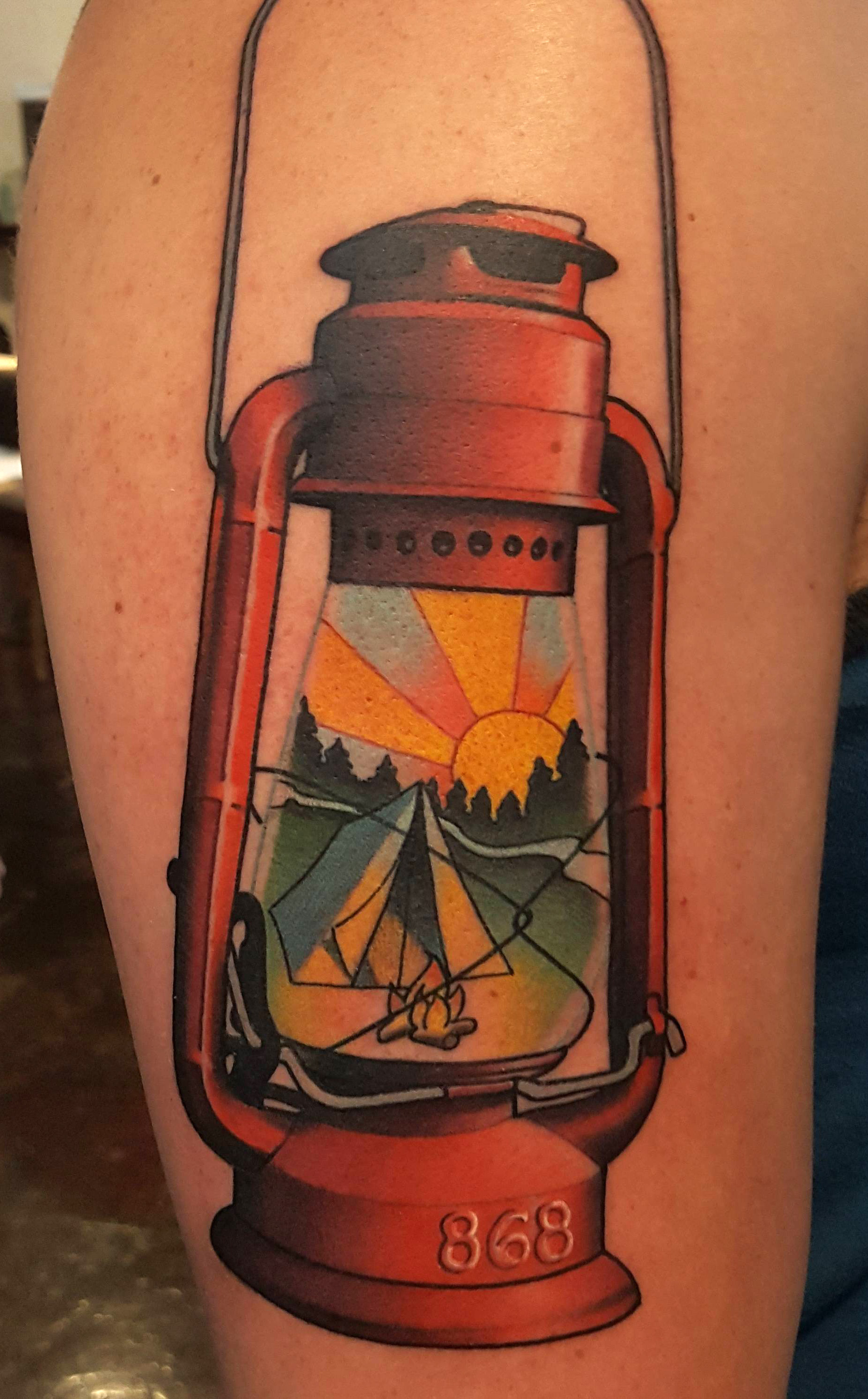 Camping lantern, tattoo by Brad Dozier at Black 13 in Nashville TN