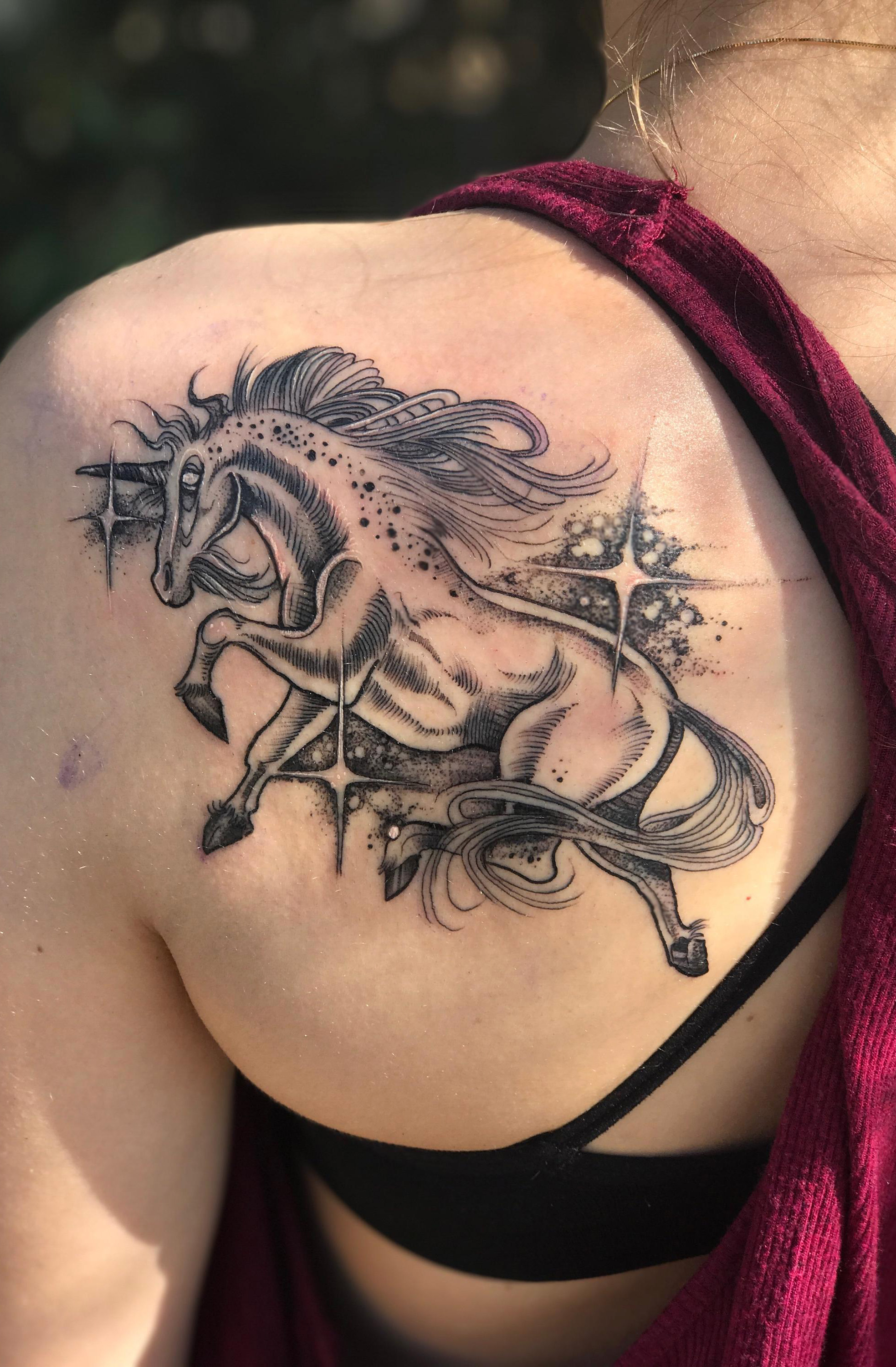 Space Unicorn tattoo by Ben Ervin @ Broken Clover Tattoo, Tucson, AZ