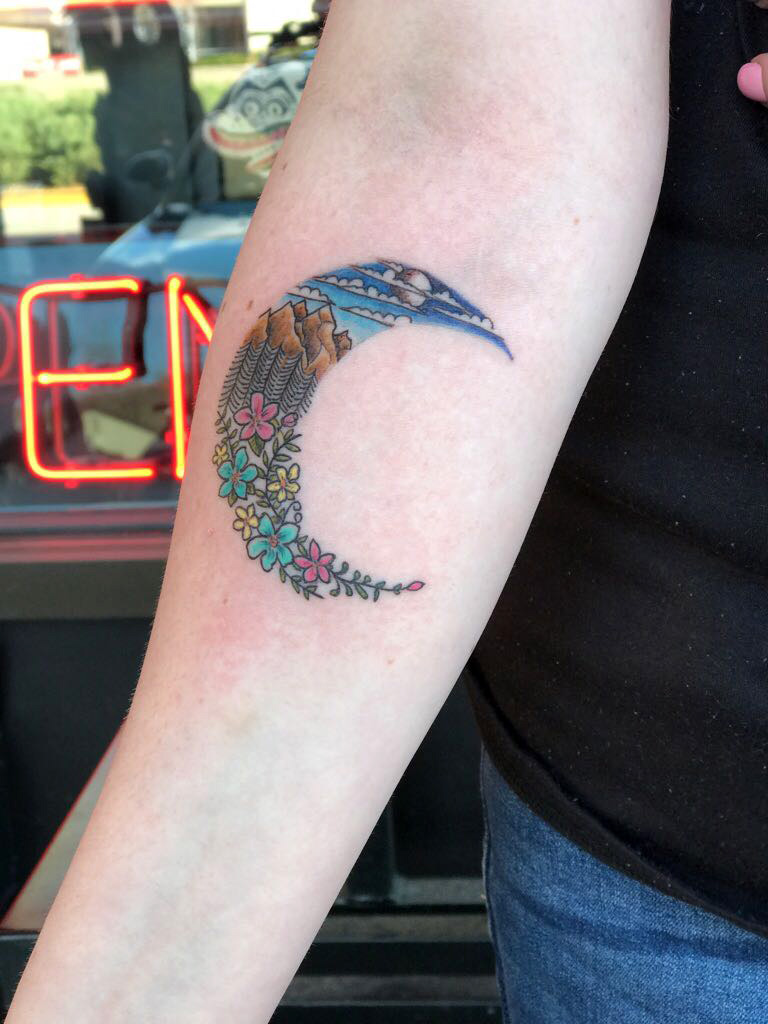 Luna, Mountains and Flowers tattoo, Landscape state of Colorado done by Enrique Lazaro at Adroit Tat