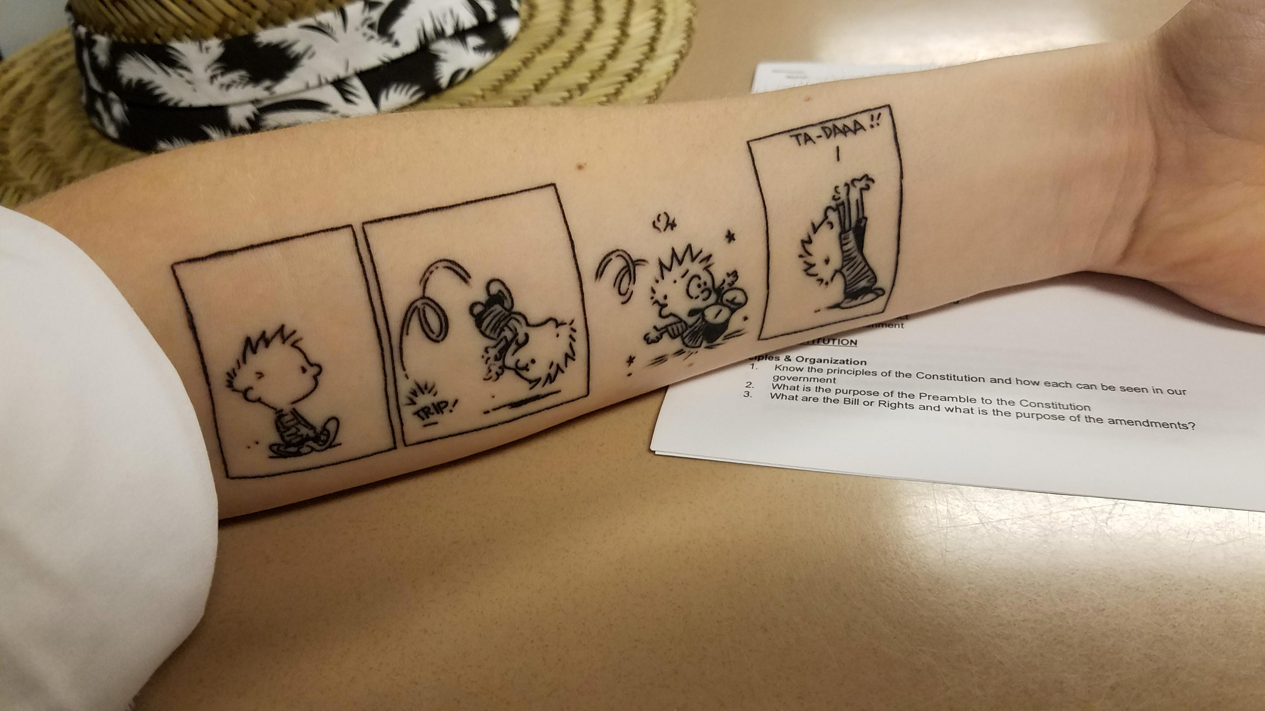 Calvin and Hobbes strip, done at Warlocks Tattoos in Cary, NC