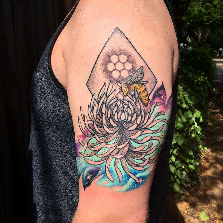 Chrysanthemum tattoo by Blayne Bius @ Live Free Tattoo, Atlanta, GA