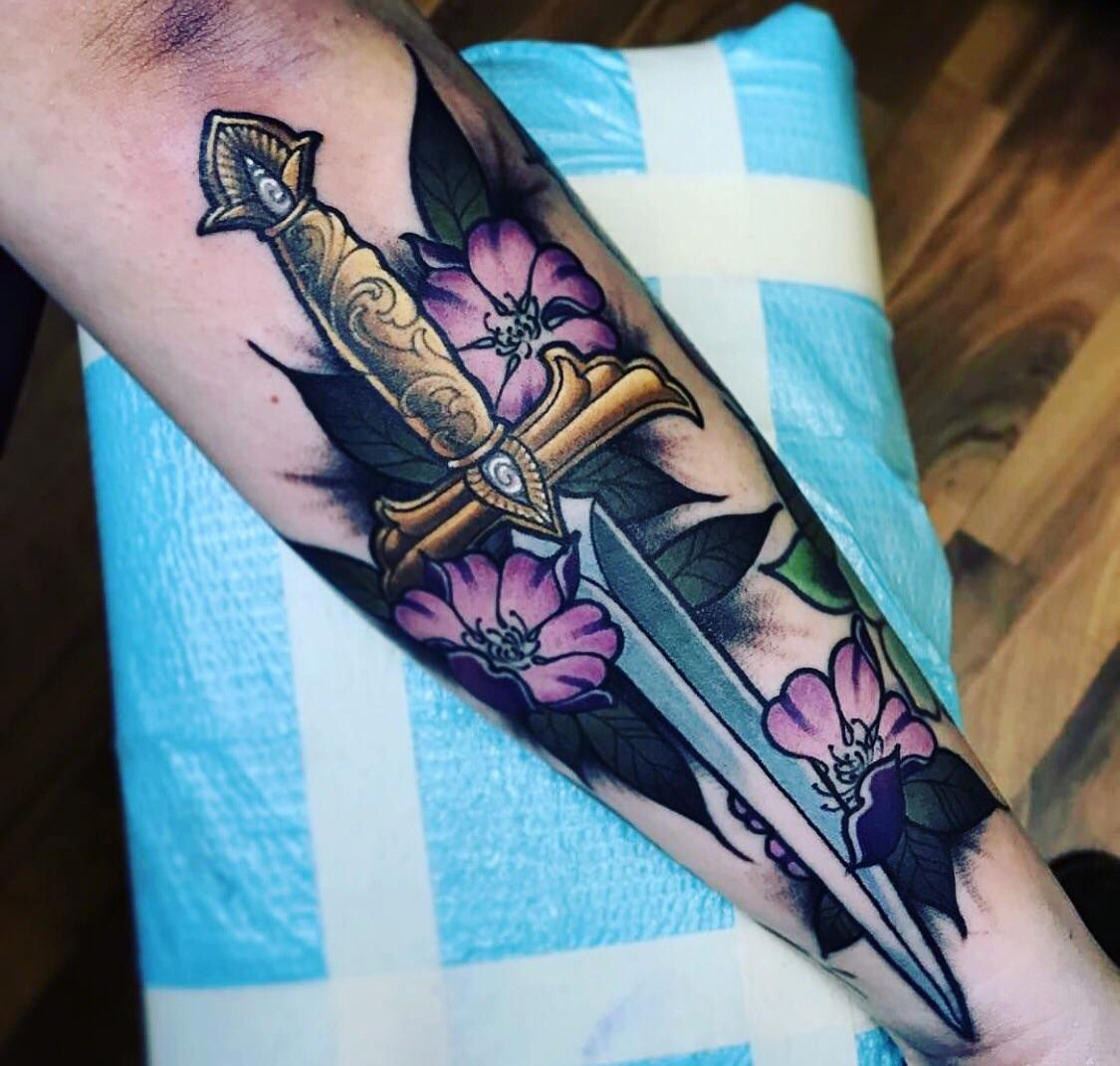 Dagger tattoo by Taylor Moses Heald at Sink or Swim Tattoo in North Tonawanda, NY